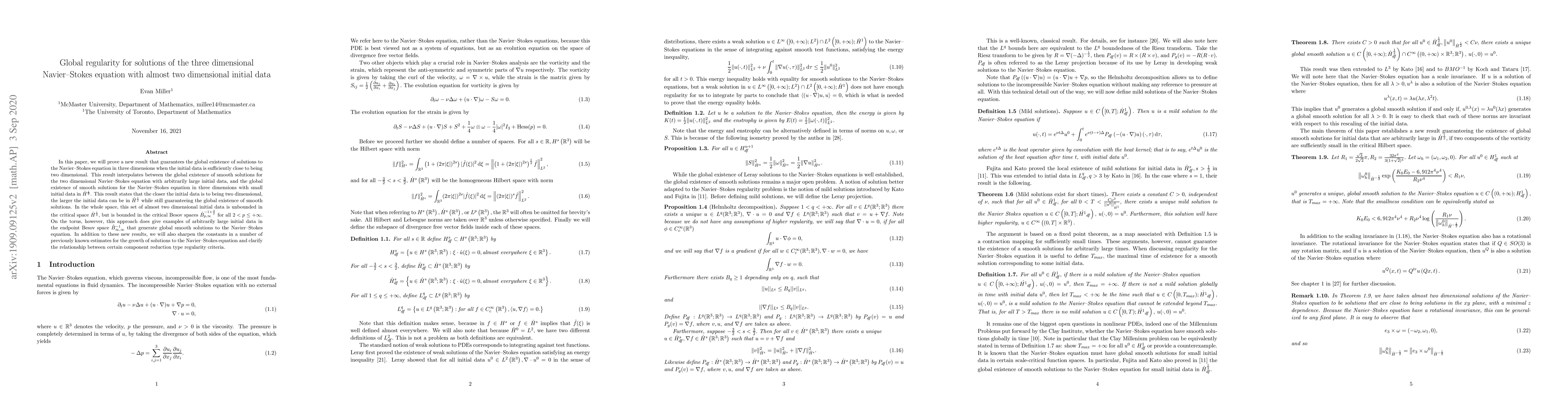 In this paper, we will prove a new result that guarantees the global existence of solutions to the Navier--Stokes equation in three dimensions when the initial data is sufficiently close to being two dimensional. This result interpolates between the global existence of smooth solutions for the two dimensional Navier--Stokes equation with arbitrarily large initial data, and the global existence of smooth solutions for the Navier--Stokes equation in three dimensions with small initial data in $\dot{H}^\frac{1}{2}$. This result states that the closer the initial data is to being two dimensional, the larger the initial data can be in $\dot{H}^\frac{1}{2}$ while still guaranteeing the global existence of smooth solutions. In the whole space, this set of almost two dimensional initial data is unbounded in the critical space $\dot{H}^\frac{1}{2},$ but is bounded in the critical Besov spaces $\dot{B}^{-1+\frac{3}{p}}_{p,\infty}$ for all $2