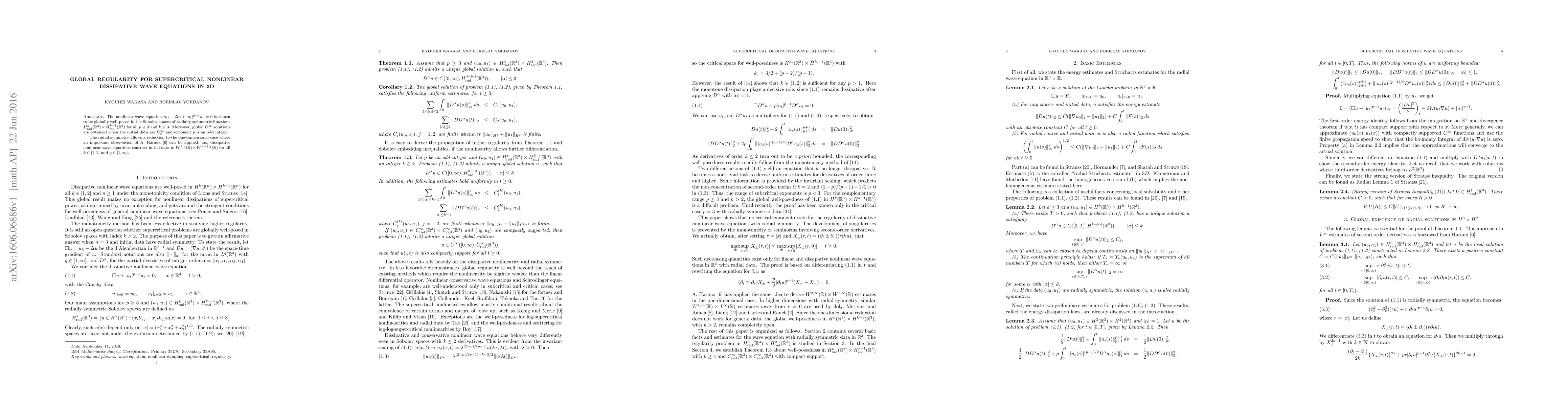 The nonlinear wave equation $u_{tt}-\Delta u +|u_t|^{p-1}u_t=0$ is shown to be globally well-posed in the Sobolev spaces of radially symmetric functions $H^k_{\rm rad}({\bf R}^3)\times H^{k-1}_{\rm rad}({\bf R}^3)$ for all $p\geq 3$ and $k\geq 3$. Moreover, global $C^\infty $ solutions are obtained when the initial data are $C_0^\infty$ and exponent $p$ is an odd integer. The radial symmetry allows a reduction to the one-dimensional case where an important observation of A. Haraux (2009) can be applied, i.e., dissipative nonlinear wave equations contract initial data in $W^{k,q}({\bf R})\times W^{k-1,q}({\bf R})$ for all $k\in[1,2]$ and $q\in [1,\infty]$.