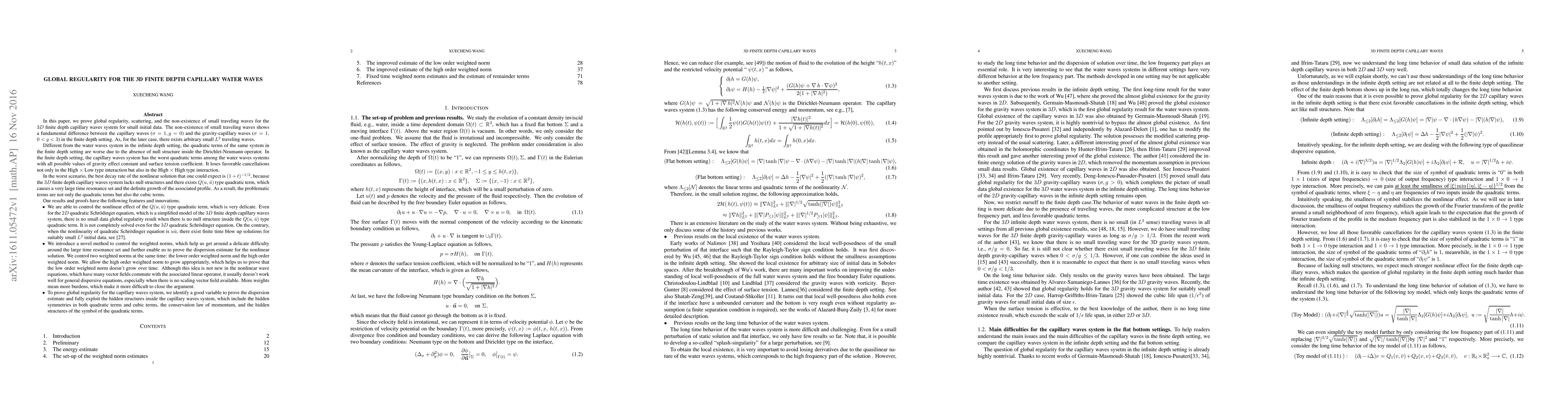 In this paper, we prove global regularity, scattering, and the non-existence of small traveling waves for the $3D$ finite depth capillary waves system for small initial data. The non-existence of small traveling waves shows a fundamental difference between the capillary waves ($\sigma=1, g=0$) and the gravity-capillary waves ($\sigma=1,$ $ 0< g< 3$) in the finite depth setting. As, for the later case, there exists arbitrary small $L^2$ traveling waves. Different from the water waves system in the infinite depth setting, the quadratic terms of the same system in the finite depth setting are worse due to the absence of null structure inside the Dirichlet-Neumann operator. In the finite depth setting, the capillary waves system has the worst quadratic terms among the water waves systems with all possible values of gravity effect constant and surface tension coefficient. It loses favorable cancellations not only in the High $\times$ Low type interaction but also in the High $\times $ High type interaction. In the worst scenario, the best decay rate of the nonlinear solution that one could expect is $ (1+t) ^ {-1/2} $, because the $3D$ finite depth capillary waves system lacks null structures and there exists $Q(u, \bar{u})$ type quadratic term, which causes a very large time resonance set and the definite growth of the associated profile. As a result, the problematic terms are not only the quadratic terms but also the cubic terms. To prove global regularity for the capillary waves system, we identify a good variable to prove the dispersion estimate, fully exploit the hidden structures inside the capillary waves system, and use a novel method to control the weighted norms.