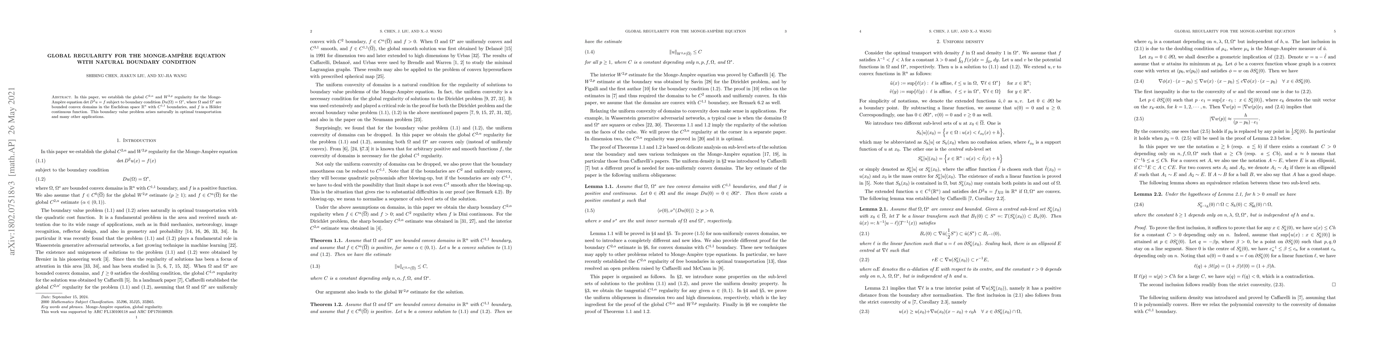 This paper proves global $C^{2,\alpha}$ and $W^{2,p}$ regularity for the Monge-Ampère equation $\det\,D^2u = f$ under natural boundary conditions, where $f$ is H\"older continuous and $\Omega$ and $\Omega^*$ are bounded convex domains with $C^{1,1}$ boundaries. This result has significant implications for optimal transportation and related applications.