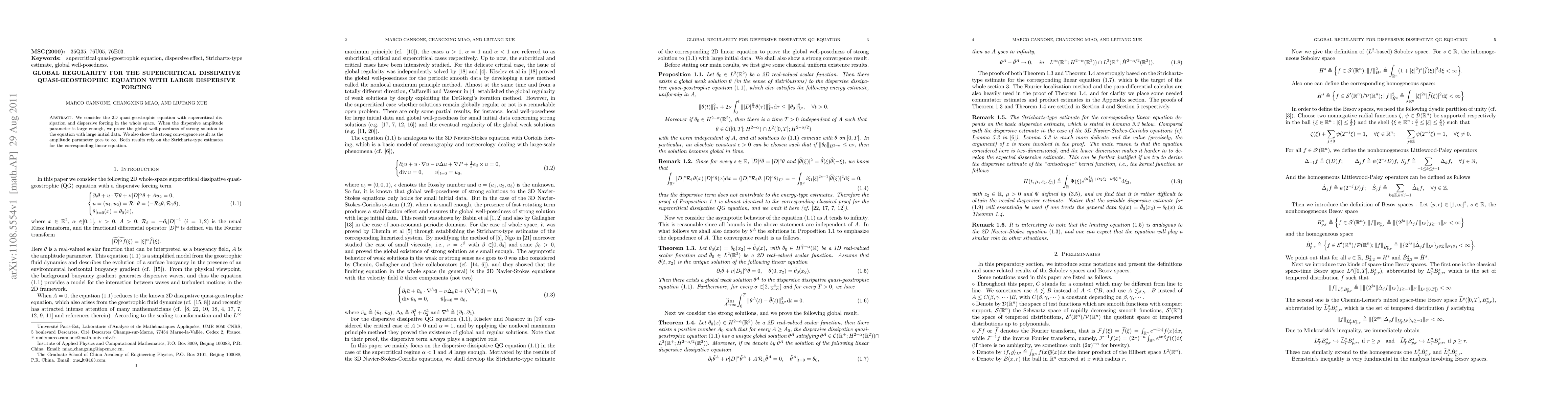 This paper proves global well-posedness for the supercritical dissipative quasi-geostrophic equation in 2D with large dispersive forcing and initial data. It also demonstrates strong convergence as the dispersive amplitude parameter tends to infinity, utilizing Strichartz-type estimates.