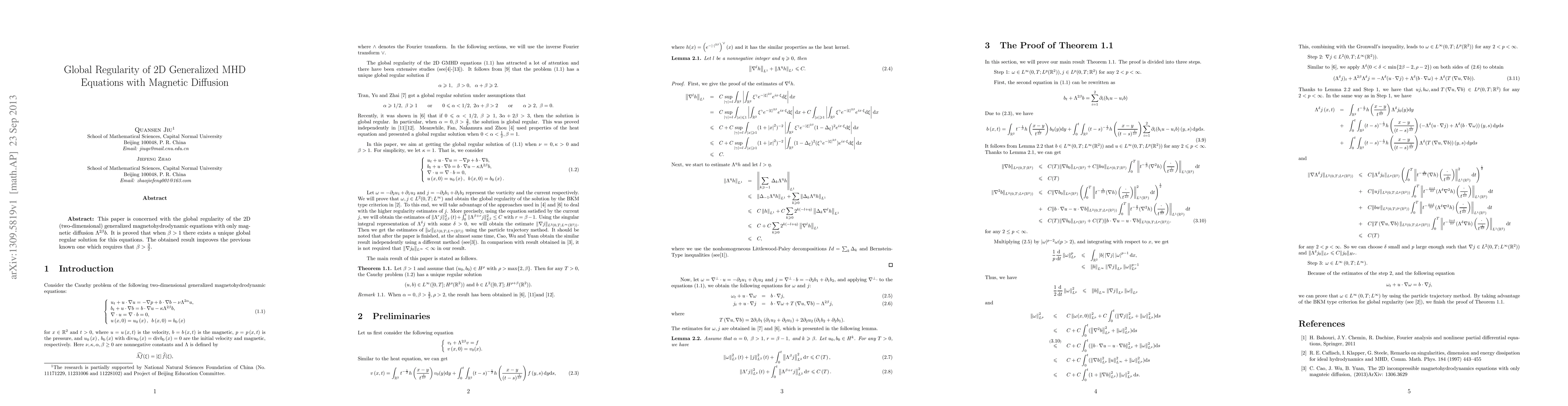 This paper proves the global regularity of 2D generalized magnetohydrodynamic equations with magnetic diffusion, showing that a unique global solution exists when $\beta > 1$, improving upon previous results requiring $\beta > \frac{3}{2}$.