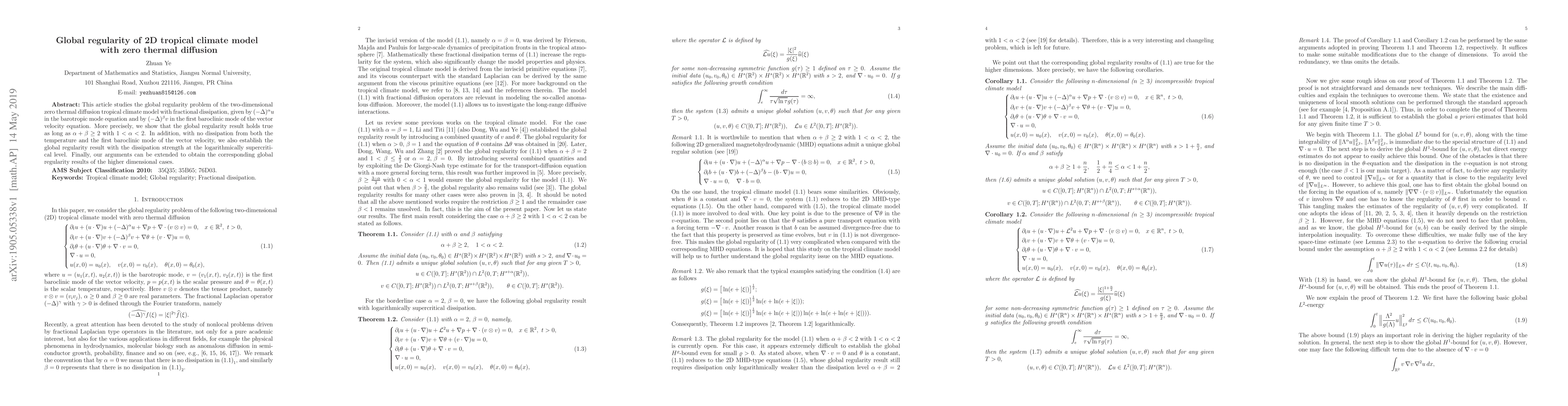 This article studies the global regularity problem of the two-dimensional zero thermal diffusion tropical climate model with fractional dissipation, given by $(-\Delta)^{\alpha}u$ in the barotropic mode equation and by $(-\Delta)^{\beta}v$ in the first baroclinic mode of the vector velocity equation. More precisely, we show that the global regularity result holds true as long as $\alpha+\beta\geq2$ with $1<\alpha<2$. In addition, with no dissipation from both the temperature and the first baroclinic mode of the vector velocity, we also establish the global regularity result with the dissipation strength at the logarithmically supercritical level. Finally, our arguments can be extended to obtain the corresponding global regularity results of the higher dimensional cases.