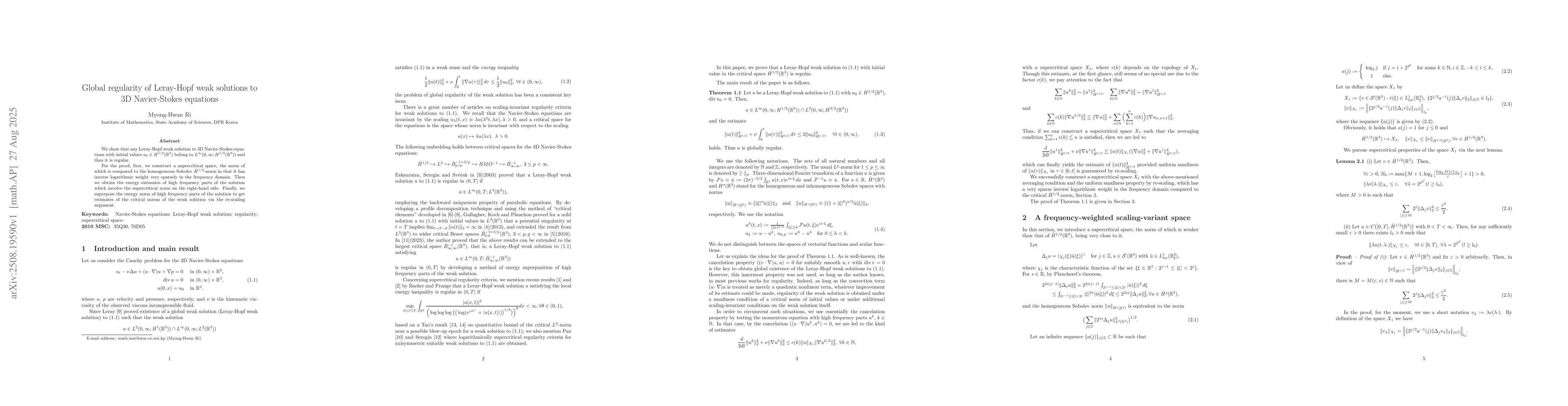 We show that any Leray-Hopf weak solution to 3D Navier-Stokes equations with initial values u0 2 H1=2(R3) belong to L1(0; 1; H1=2(R3)) and thus it is regular. For the proof, flrst, we construct a supercritical space, the norm of which is compared to the homogeneous Sobolev H_ 1=2-norm in that it has inverse logarithmic weight very sparsely in the frequency domain. Then we obtain the energy estimates of high frequency parts of the solution which involve the supercritical norm on the right-hand side. Finally, we superpose the energy norm of high frequency parts of the solution to get estimates of the critical norms of the weak solution via the re-scaling argument.