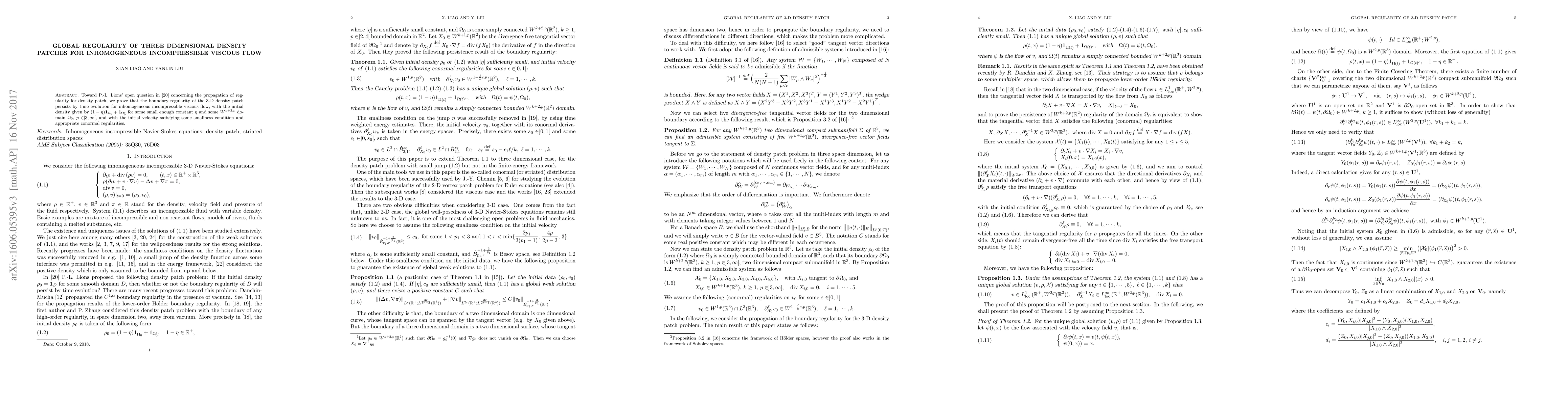 Summary: This paper proves that the boundary regularity of a three-dimensional density patch remains intact over time for inhomogeneous incompressible viscous flow, provided the initial velocity satisfies a smallness condition. The study focuses on the persistence of this regularity under time evolution.