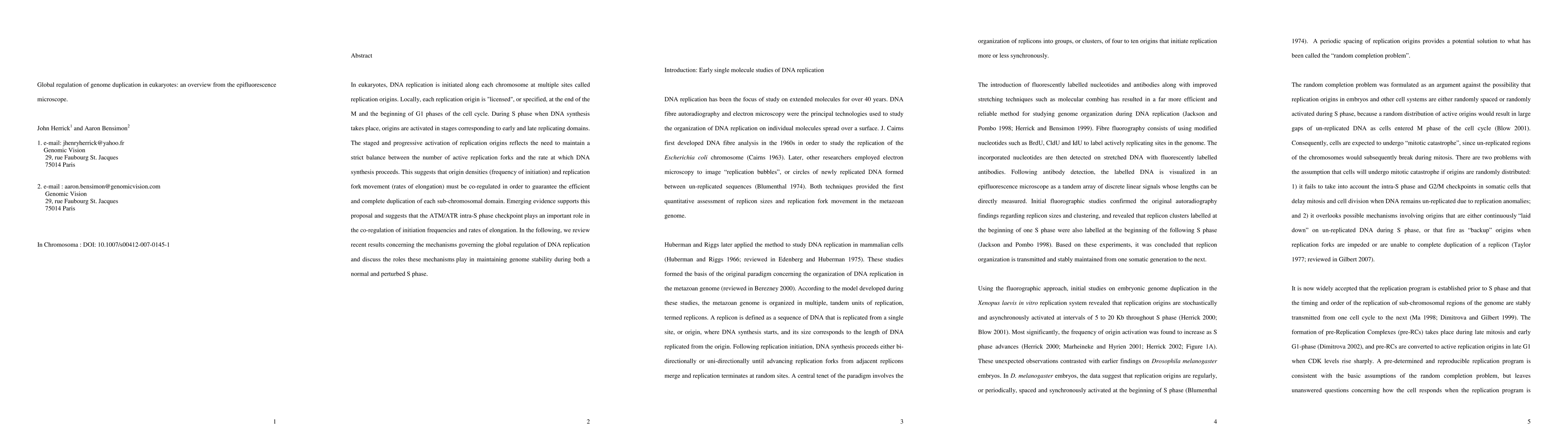 In eukaryotes, DNA replication is initiated along each chromosome at multiple sites called replication origins. Locally, each replication origin is "licensed", or specified, at the end of the M and the beginning of G1 phases of the cell cycle. During S phase when DNA synthesis takes place, origins are activated in stages corresponding to early and late replicating domains. The staged and progressive activation of replication origins reflects the need to maintain a strict balance between the number of active replication forks and the rate at which DNA synthesis procedes. This suggests that origin densities (frequency of intiation) and replication fork movement (rates of elongation) must be co-regulated in order to guarantee the efficient and complete duplication of each subchromosomal domain. Emerging evidence supports this proposal and suggests that the ATM/ATR intra-S phase checkpoint plays an important role in the co-regulation of initiation frequencies and rates of elongation. In the following, we review recent results concerning the mechanisms governing the global regulation of DNA replication and discuss the roles these mechanisms play in maintaining genome stability during both a normal and perturbed S phase.