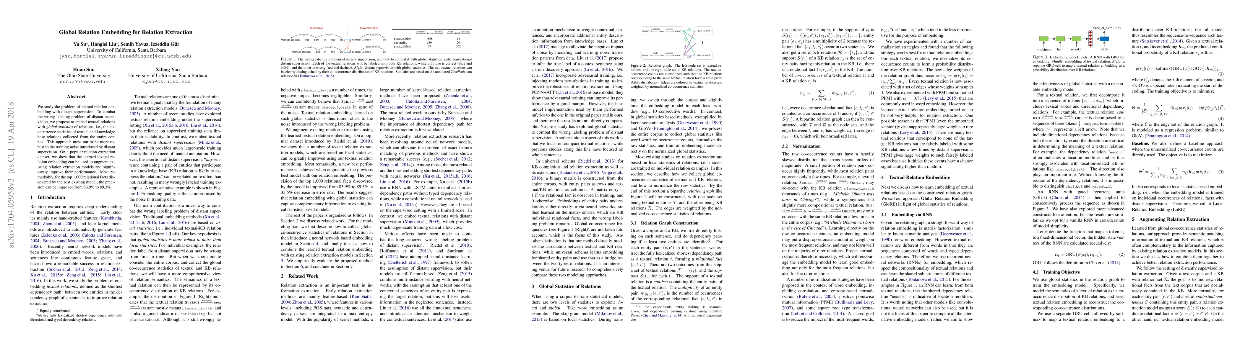 This paper proposes a method for textual relation embedding using global statistics to address the noise from distant supervision, significantly improving relation extraction model performance, especially for the top 1,000 relational facts, raising precision from 83.9% to 89.3%.