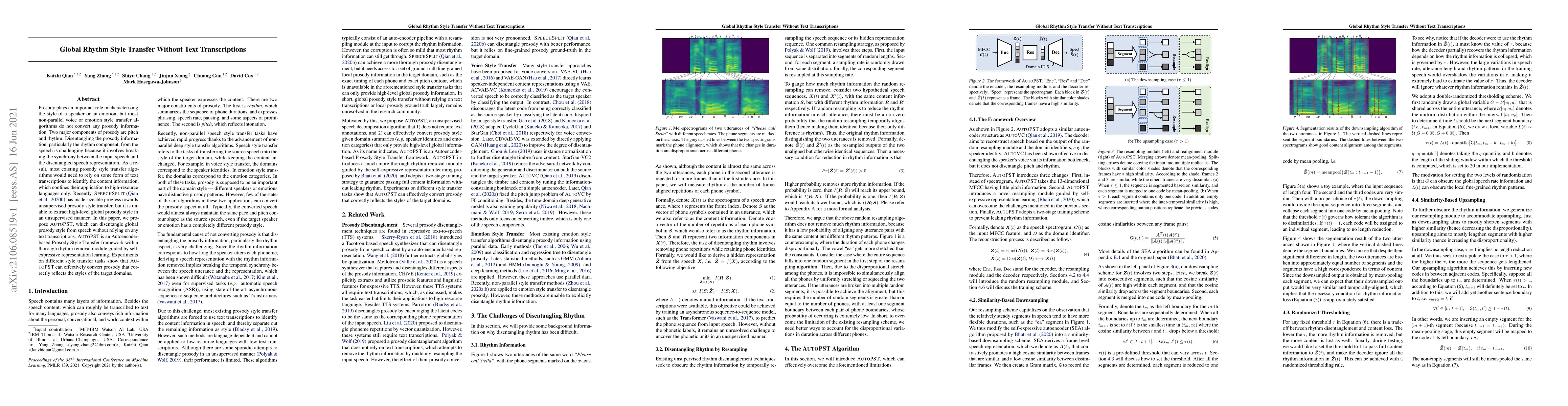 The paper proposes AutoPST, an autoencoder-based prosody style transfer framework that disentangles global prosody style from speech without text transcriptions. It uses an encoder-decoder architecture with a rhythm removal module guided by self-expressive representation learning.