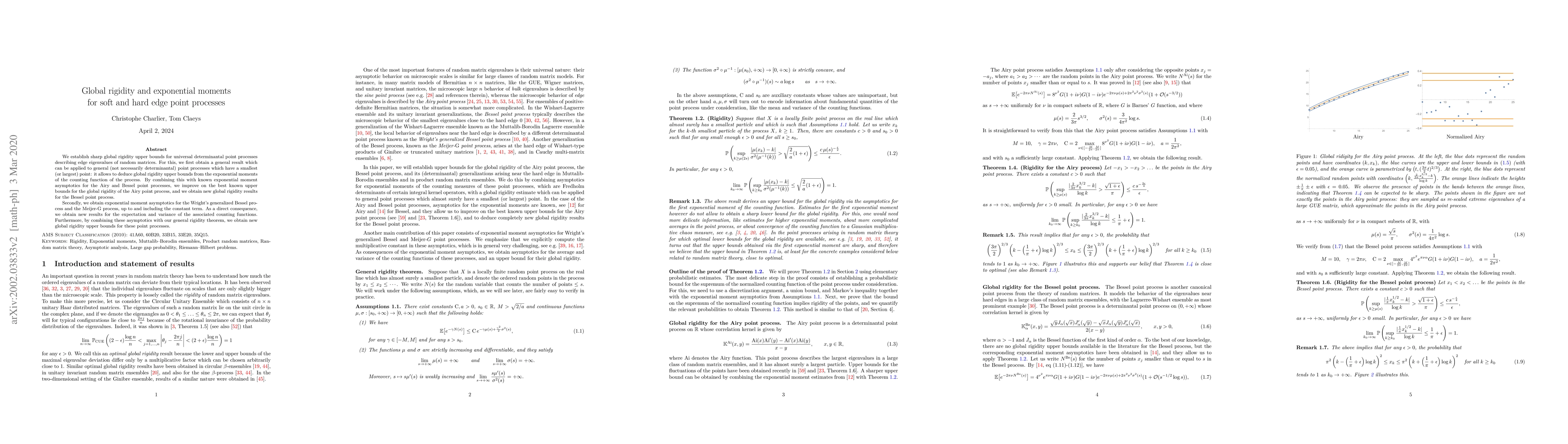 We establish sharp global rigidity upper bounds for universal determinantal point processes describing edge eigenvalues of random matrices. For this, we first obtain a general result which can be applied to general (not necessarily determinantal) point processes which have a smallest (or largest) point: it allows to deduce global rigidity upper bounds from the exponential moments of the counting function of the process. By combining this with known exponential moment asymptotics for the Airy and Bessel point processes, we improve on the best known upper bounds for the global rigidity of the Airy point process, and we obtain new global rigidity results for the Bessel point process. Secondly, we obtain exponential moment asymptotics for the Wright's generalized Bessel process and the Meijer-$\mathrm{G}$ process, up to and including the constant term. As a direct consequence, we obtain new results for the expectation and variance of the associated counting functions. Furthermore, by combining these asymptotics with our general rigidity theorem, we obtain new global rigidity upper bounds for these point processes.