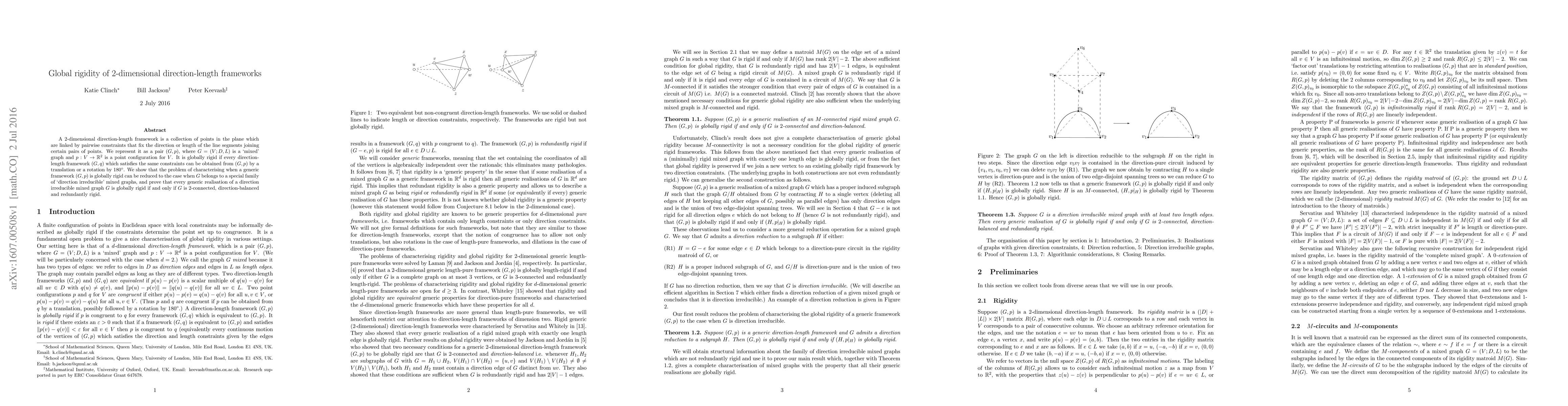 A 2D direction-length framework is globally rigid if it can only be transformed by translation or rotation by 180 degrees. The paper proves that a generic framework is globally rigid if and only if its underlying graph is 2-connected, direction-balanced, and redundantly rigid.