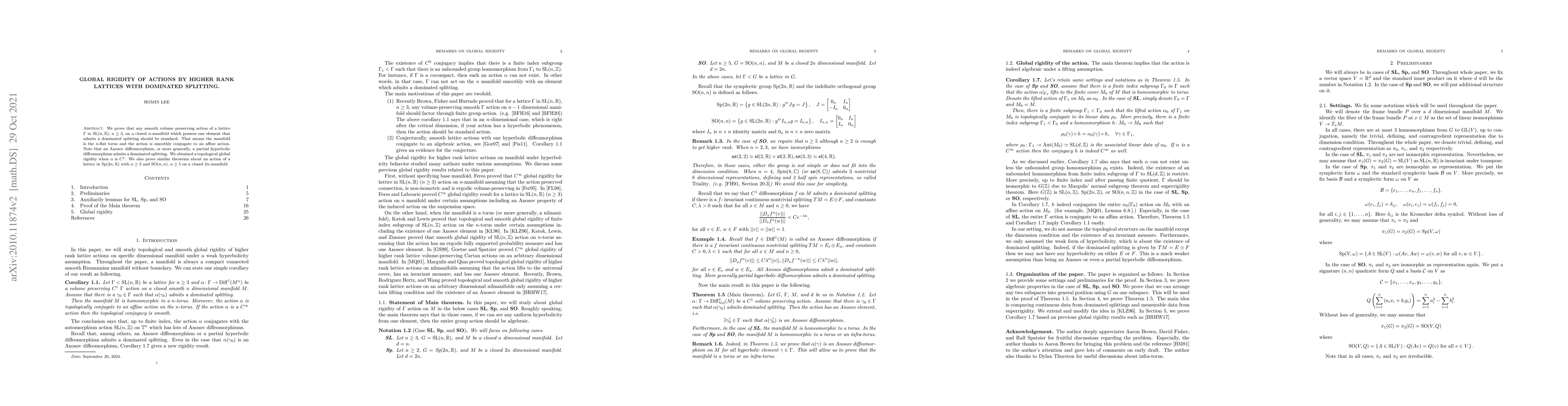 We prove that any smooth volume-preserving action of a lattice $\Gamma$ in $\textrm{SL}(n,\mathbb{R})$, $n\ge 3$, on a closed $n$-manifold which possesses one element that admits a dominated splitting should be standard. In other words, the manifold is the $n$-flat torus and the action is smoothly conjugate to an affine action. Note that an Anosov diffeomorphism, or more generally, a partial hyperbolic diffeomorphism admits a dominated splitting. We have a topological global rigidity when $\alpha$ is $C^{1}$. Similar theorems hold for an action of a lattice in $\textrm{Sp}(2n,\mathbb{R})$ with $n\ge 2$ and $\textrm{SO}(n,n)$ with $n\ge 5$ on a closed $2n$-manifold.