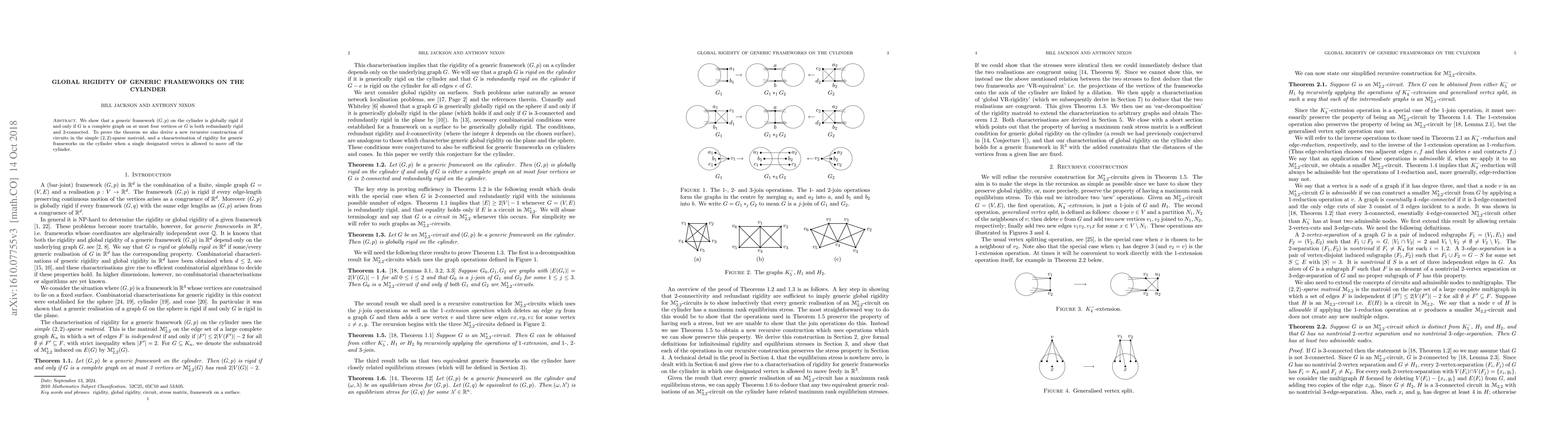 This paper establishes the global rigidity conditions for generic frameworks on the cylinder, proving that such frameworks are globally rigid if they form a complete graph with at most four vertices or are both redundantly rigid and 2-connected. The proof involves a new recursive circuit construction in simple (2,2)-sparse matroids and a characterization of rigidity when a single vertex is allowed to move.