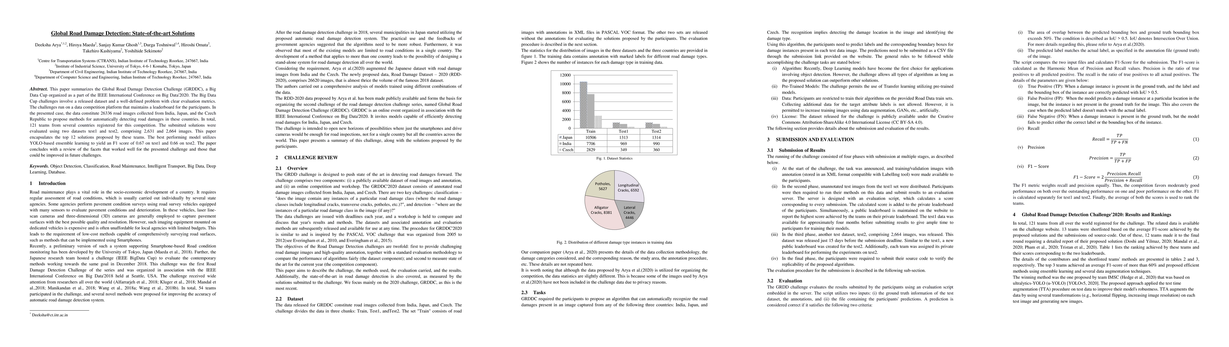 This paper summarizes the Global Road Damage Detection Challenge (GRDDC), highlighting the top 12 solutions from 121 teams using datasets from India, Japan, and the Czech Republic. The best model employs YOLO-based ensemble learning, achieving an F1 score of 0.67 and 0.66 on test datasets.