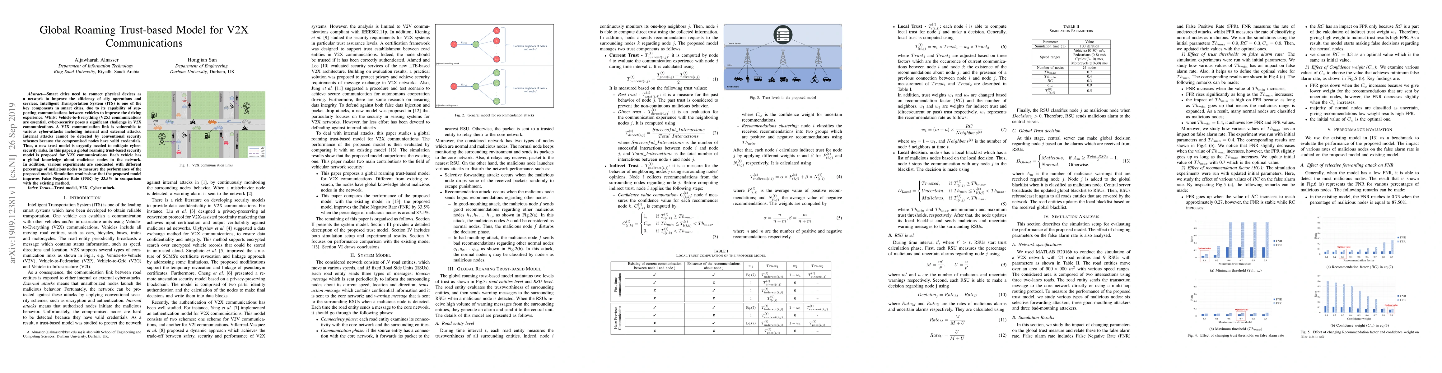 This paper proposes a global roaming trust-based security model to enhance cyber-security for Vehicle-to-Everything (V2X) communications in smart cities, addressing vulnerabilities to internal and external cyber-attacks. Simulation results indicate a 33.5% improvement in False Negative Rate compared to existing methods.