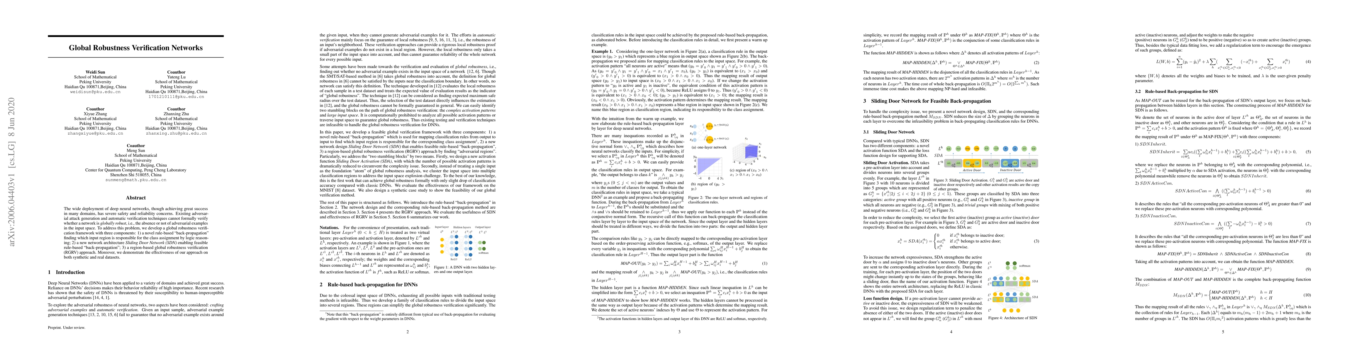 This paper proposes a framework for globally verifying the robustness of deep neural networks, introducing a rule-based "back-propagation" method, a novel Sliding Door Network architecture, and a region-based global robustness verification approach, demonstrating its effectiveness on various datasets.