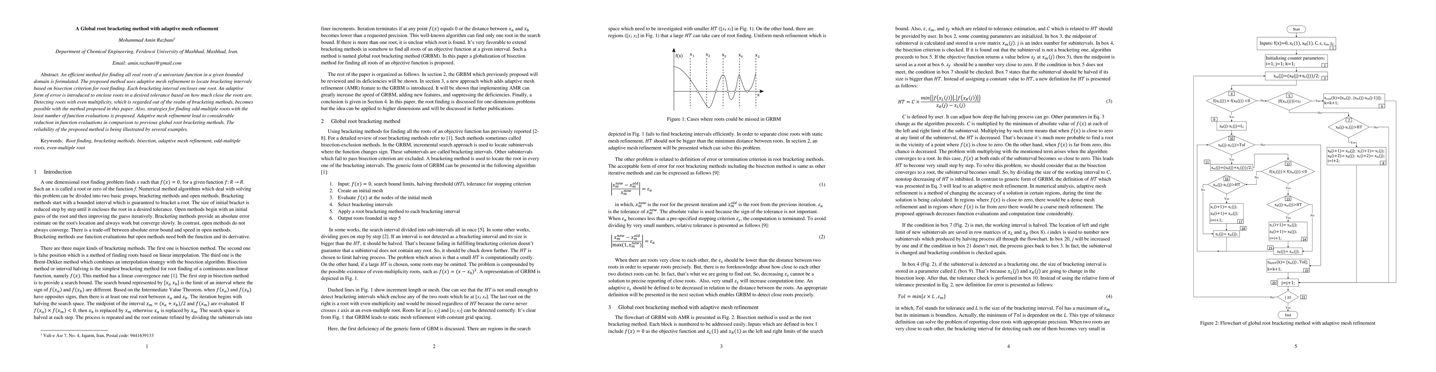 This paper introduces a global root bracketing method with adaptive mesh refinement for finding all real roots of a univariate function. It employs adaptive error-based refinement to locate bracketing intervals, enabling detection of roots with multiplicity and reducing function evaluations compared to previous methods.