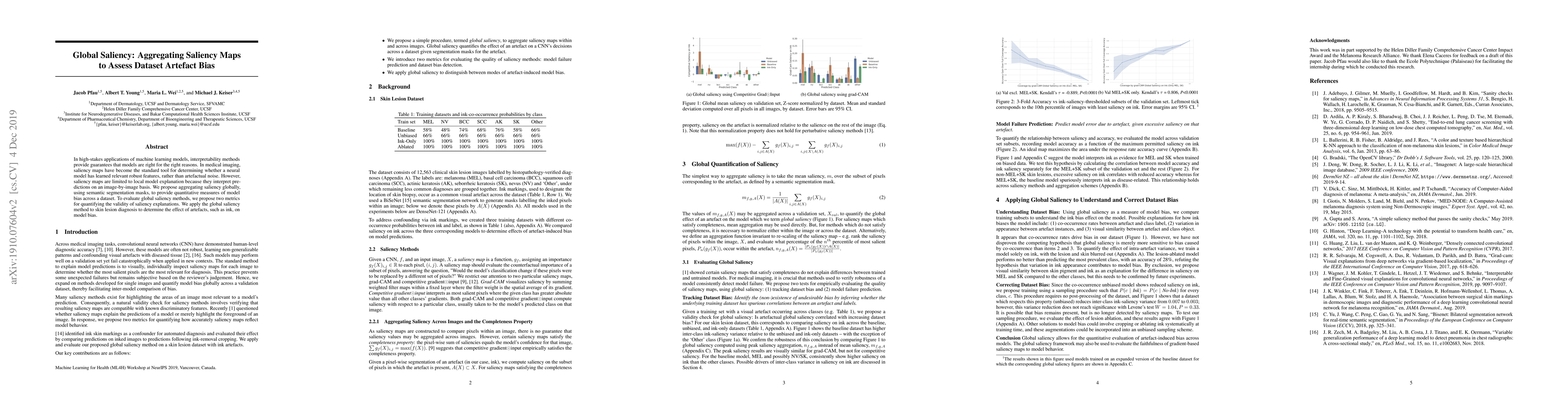 In high-stakes applications of machine learning models, interpretability methods provide guarantees that models are right for the right reasons. In medical imaging, saliency maps have become the standard tool for determining whether a neural model has learned relevant robust features, rather than artefactual noise. However, saliency maps are limited to local model explanation because they interpret predictions on an image-by-image basis. We propose aggregating saliency globally, using semantic segmentation masks, to provide quantitative measures of model bias across a dataset. To evaluate global saliency methods, we propose two metrics for quantifying the validity of saliency explanations. We apply the global saliency method to skin lesion diagnosis to determine the effect of artefacts, such as ink, on model bias.