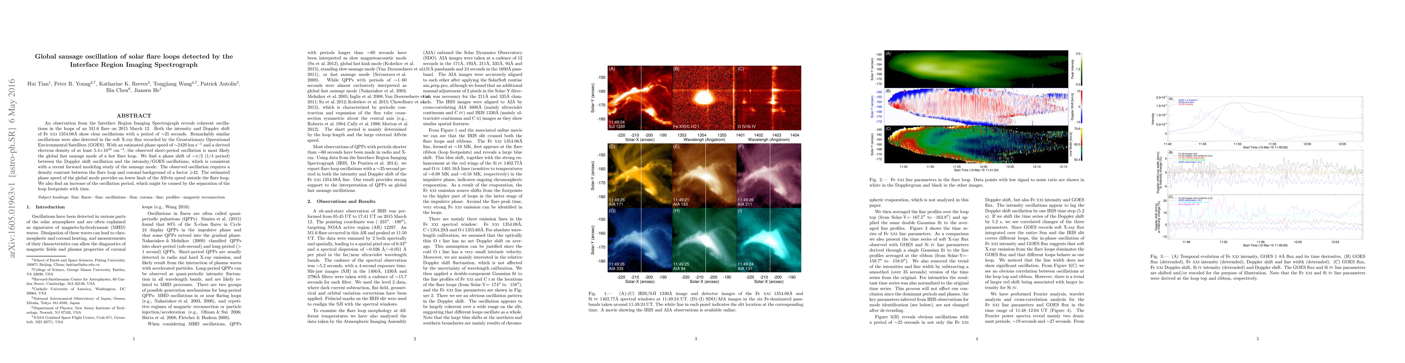 An observation from the Interface Region Imaging Spectrograph reveals coherent oscillations in the loops of an M1.6 flare on 2015 March 12. Both the intensity and Doppler shift of Fe~{\sc{xxi}}~1354.08\AA{}~show clear oscillations with a period of $\sim$25 seconds. Remarkably similar oscillations were also detected in the soft X-ray flux recorded by the Geostationary Operational Environmental Satellites (GOES). With an estimated phase speed of $\sim$2420~km~s$^{-1}$ and a derived electron density of at least 5.4$\times$10$^{10}$ cm$^{-3}$, the observed short-period oscillation is most likely the global fast sausage mode of a hot flare loop. We find a phase shift of $\sim$$\pi$/2 (1/4 period) between the Doppler shift oscillation and the intensity/GOES oscillations, which is consistent with a recent forward modeling study of the sausage mode. The observed oscillation requires a density contrast between the flare loop and coronal background of a factor $\geqslant$42. The estimated phase speed of the global mode provides an lower limit of the Alfv\'en speed outside the flare loop. We also find an increase of the oscillation period, which might be caused by the separation of the loop footpoints with time.