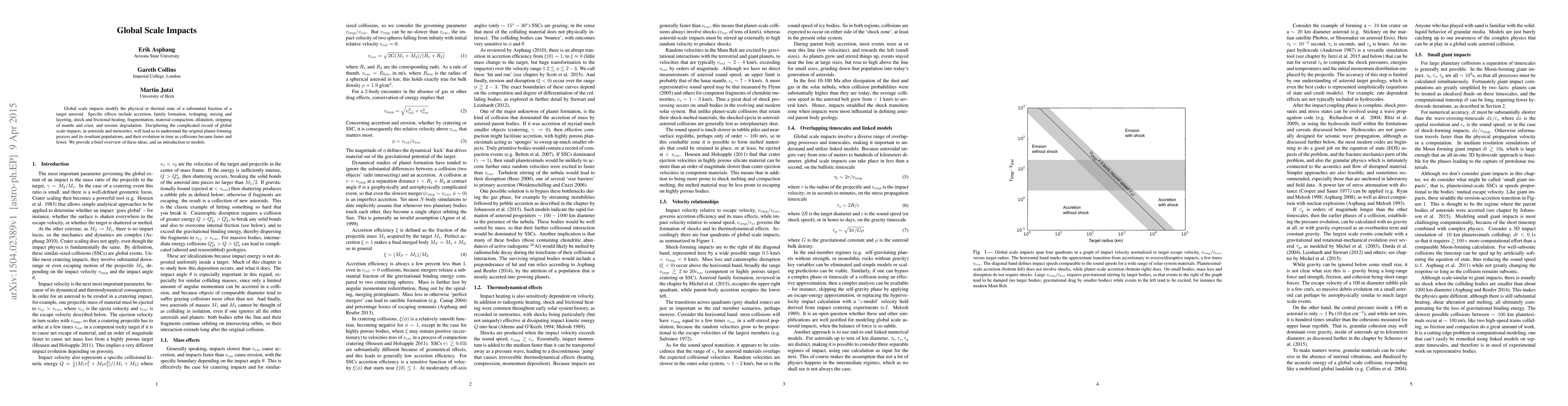 Global scale impacts modify the physical or thermal state of a substantial fraction of a target asteroid. Specific effects include accretion, family formation, reshaping, mixing and layering, shock and frictional heating, fragmentation, material compaction, dilatation, stripping of mantle and crust, and seismic degradation. Deciphering the complicated record of global scale impacts, in asteroids and meteorites, will lead us to understand the original planet-forming process and its resultant populations, and their evolution in time as collisions became faster and fewer. We provide a brief overview of these ideas, and an introduction to models.