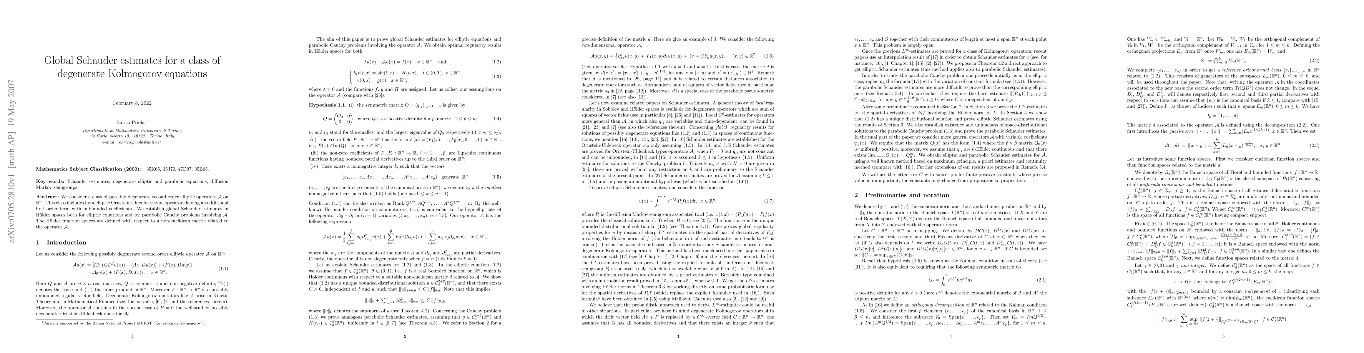 We consider a class of possibly degenerate second order elliptic operators $\cal A$ on $\R^n$. This class includes hypoelliptic Ornstein-Uhlenbeck type operators having an additional first order term with unbounded coefficients. We establish global Schauder estimates in H\"older spaces both for elliptic equations and for parabolic Cauchy problems involving ${\cal A}$. The H\"older function spaces are defined with respect to a non-euclidean metric related to the operator $\cal A$.