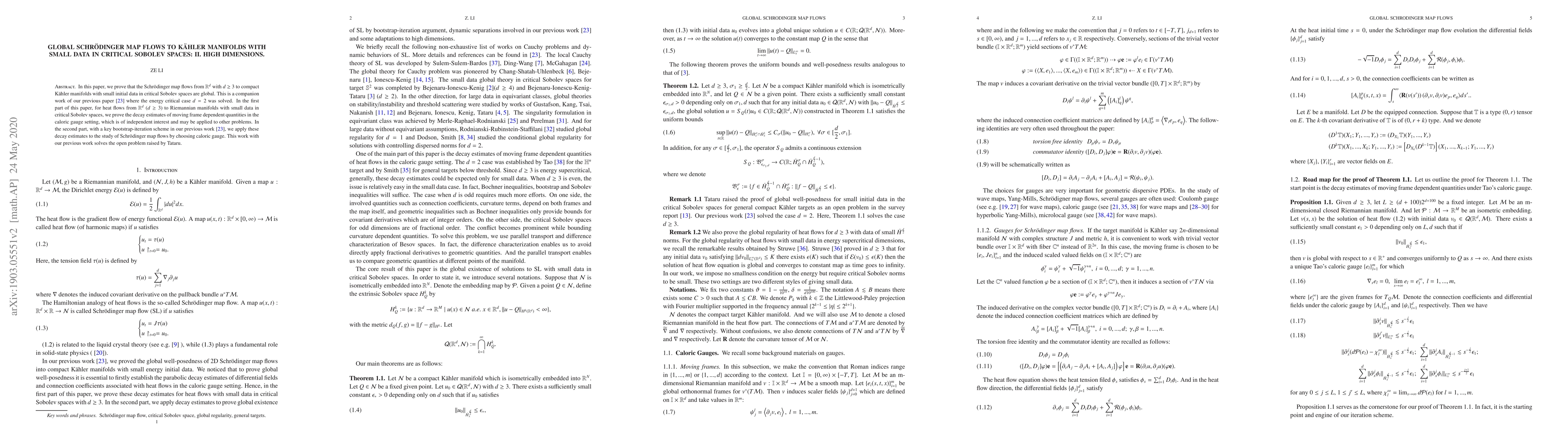 In this paper, we prove that the Schr\"odinger map flows from $\Bbb R^d$ with $d\ge 3$ to compact K\"ahler manifolds with small initial data in critical Sobolev spaces are global. This is a companion work of our previous paper [23] where the energy critical case $d=2$ was solved. In the first part of this paper, for heat flows from $\Bbb R^d$ ($d\ge 3$) to Riemannian manifolds with small data in critical Sobolev spaces, we prove the decay estimates of moving frame dependent quantities in the caloric gauge setting, which is of independent interest and may be applied to other problems. In the second part, with a key bootstrap-iteration scheme in our previous work [23], we apply these decay estimates to the study of Schr\"odinger map flows by choosing caloric gauge. This work with our previous work solves the open problem raised by Tataru.
