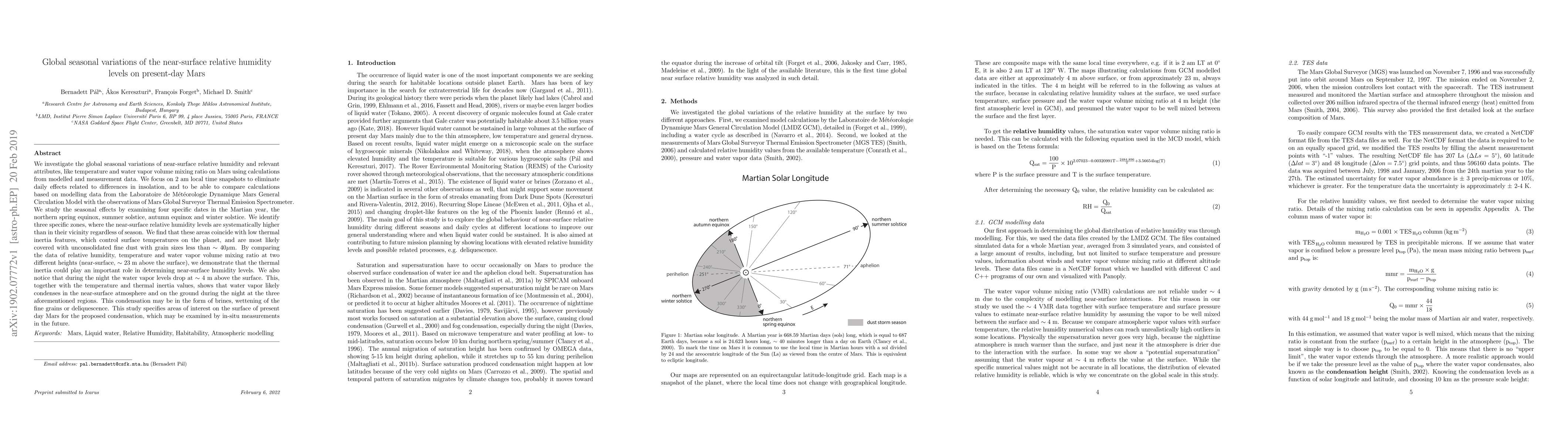 This study investigates the global seasonal variations of near-surface relative humidity on Mars, identifying three zones with consistently higher humidity levels. These areas, characterized by low thermal inertia and fine dust, show evidence of water vapor condensation during the night, likely forming brines or deliquescing grains.