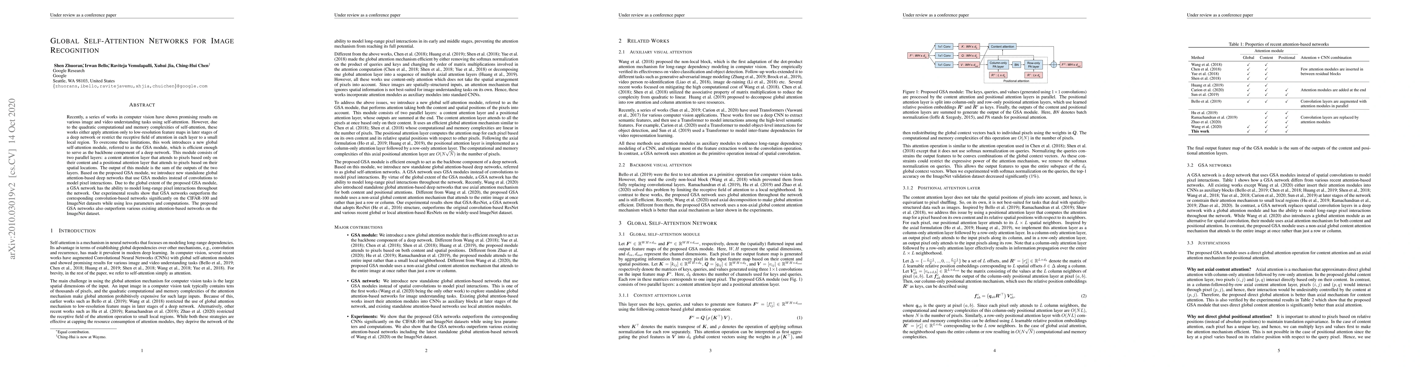 This paper proposes Global Self-Attention Networks (GSA networks) that utilize a new efficient global self-attention module to model long-range pixel interactions, outperforming convolution-based networks on CIFAR-100 and ImageNet while using fewer parameters and computations.