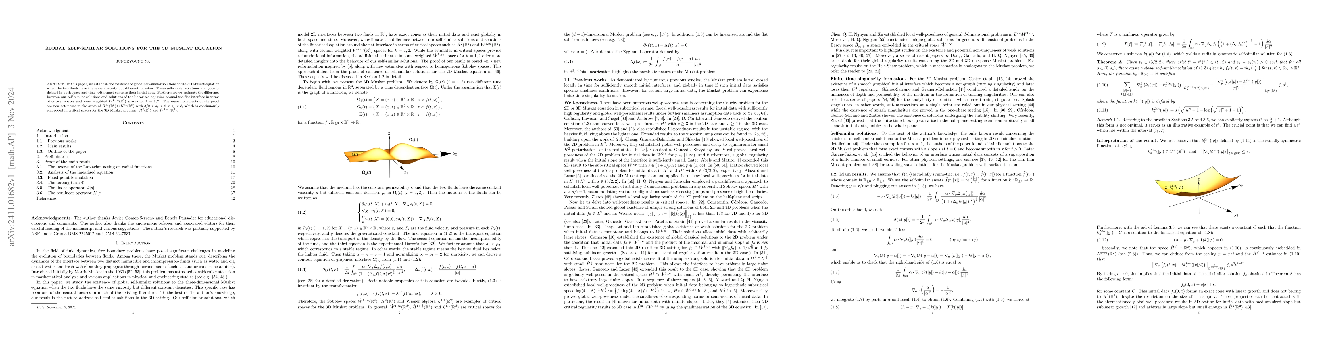 This paper establishes the existence of global self-similar solutions for the 3D Muskat equation, where two fluids have equal viscosity but different densities. The solutions are defined in space and time with exact conical initial data, and the paper estimates their difference from linearized solutions using critical spaces and weighted $\dot{W}^{k,\infty}(\mathbb{R}^2)$ spaces.