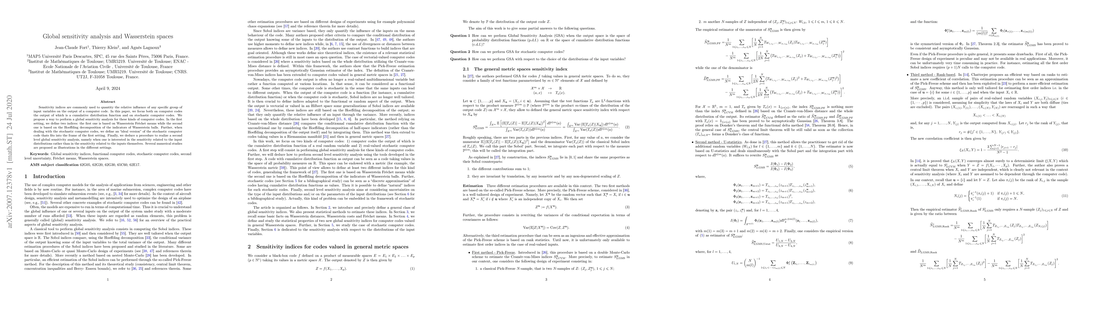 Sensitivity indices are commonly used to quantity the relative inuence of any specic group of input variables on the output of a computer code. In this paper, we focus both on computer codes the output of which is a cumulative distribution function and on stochastic computer codes. We propose a way to perform a global sensitivity analysis for these kinds of computer codes. In the rst setting, we dene two indices: the rst one is based on Wasserstein Fr{\'e}chet means while the second one is based on the Hoeding decomposition of the indicators of Wasserstein balls. Further, when dealing with the stochastic computer codes, we dene an ideal version of the stochastic computer code thats ts into the frame of the rst setting. Finally, we deduce a procedure to realize a second level global sensitivity analysis, namely when one is interested in the sensitivity related to the input distributions rather than in the sensitivity related to the inputs themselves. Several numerical studies are proposed as illustrations in the dierent settings.