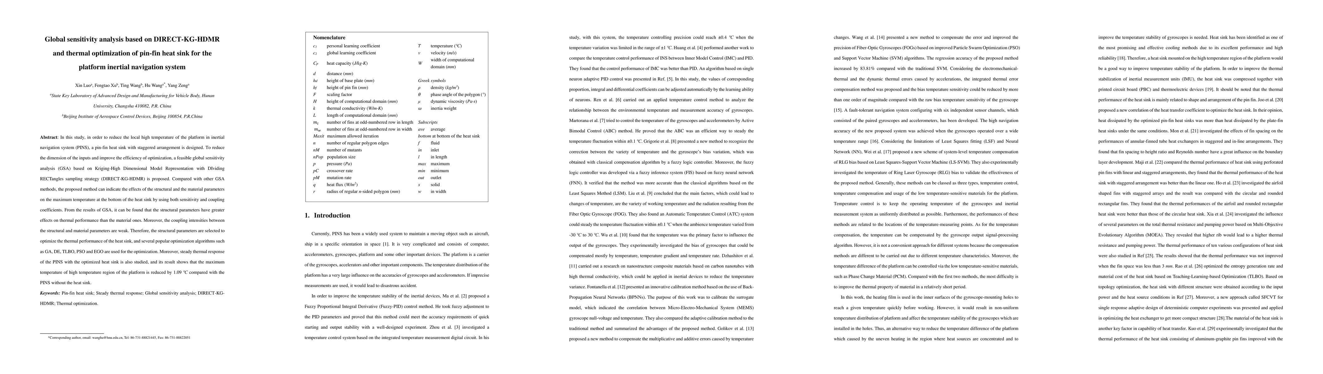 In this study, in order to reduce the local high temperature of the platform in inertial navigation system (PINS), a pin-fin heat sink with staggered arrangement is designed. To reduce the dimension of the inputs and improve the efficiency of optimization, a feasible global sensitivity analysis (GSA) based on Kriging-High Dimensional Model Representation with DIviding RECTangles sampling strategy (DIRECT-KG-HDMR) is proposed. Compared with other GSA methods, the proposed method can indicate the effects of the structural and the material parameters on the maximum temperature at the bottom of the heat sink by using both sensitivity and coupling coefficients. From the results of GSA, it can be found that the structural parameters have greater effects on thermal performance than the material ones. Moreover, the coupling intensities between the structural and material parameters are weak. Therefore, the structural parameters are selected to optimize the thermal performance of the heat sink, and several popular optimization algorithms such as GA, DE, TLBO, PSO and EGO are used for the optimization. Moreover, steady thermal response of the PINS with the optimized heat sink is also studied, and its result shows that the maximum temperature of high temperature region of the platform is reduced by 1.09 degree Celsius compared with the PINS without the heat sink.