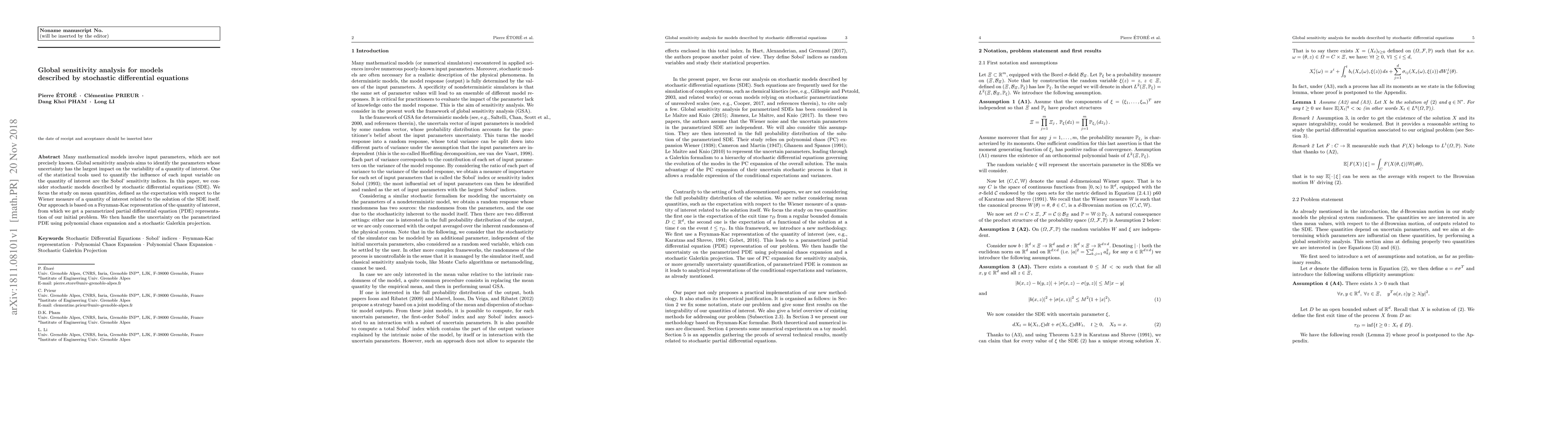 This paper explores global sensitivity analysis for stochastic differential equations (SDE) models, focusing on mean quantities. It employs a Feynman-Kac representation to derive a parametrized PDE and uses polynomial chaos expansion and stochastic Galerkin projection to quantify the influence of input parameters on the output variability.