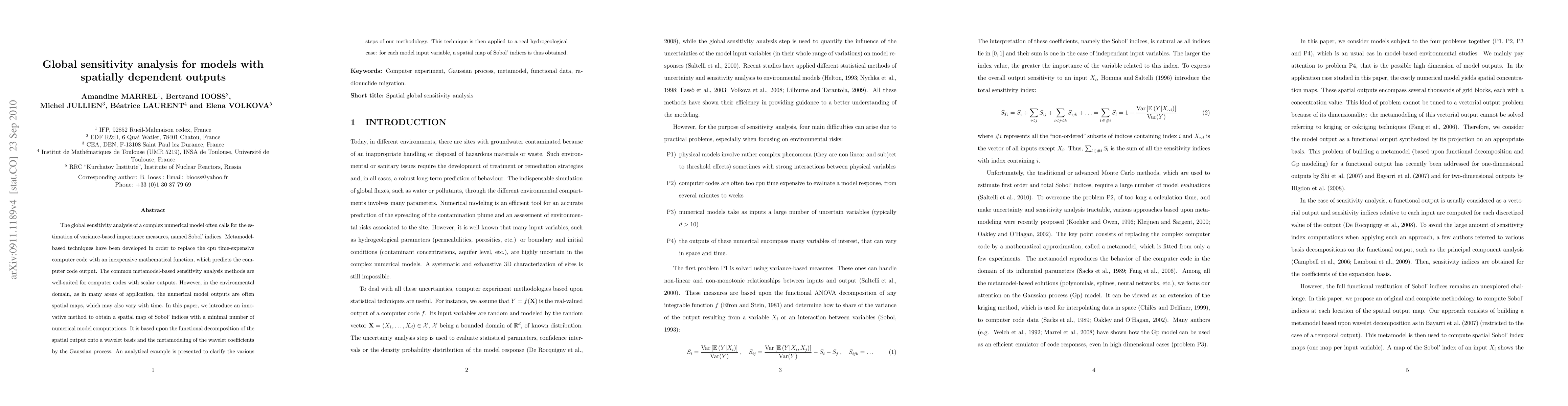 This paper proposes a novel method for global sensitivity analysis of models with spatially dependent outputs by decomposing spatial outputs into wavelets and using Gaussian processes for metamodeling. This approach efficiently computes spatial maps of Sobol' indices with minimal computational effort, demonstrated through an analytical example and a hydrogeological case study.