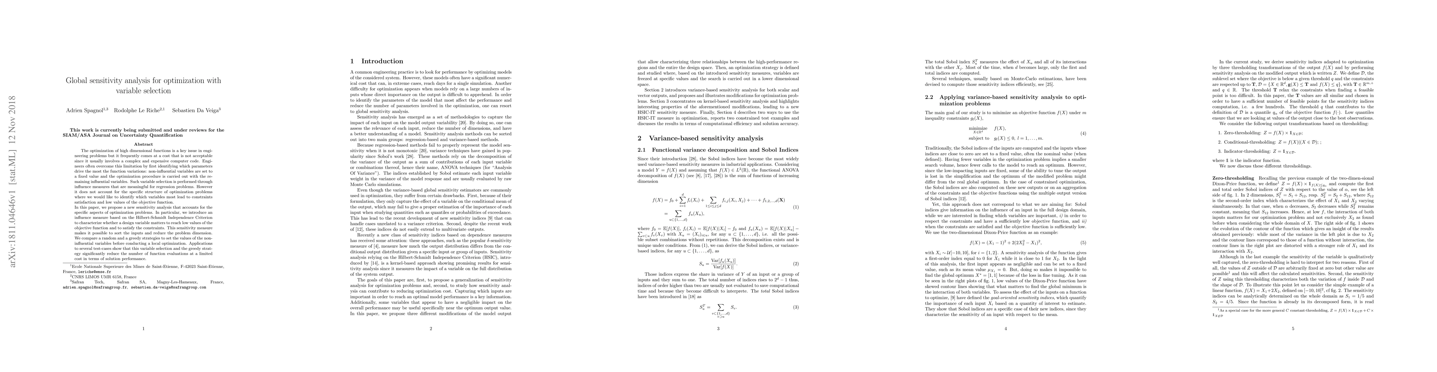 The optimization of high dimensional functions is a key issue in engineering problems but it frequently comes at a cost that is not acceptable since it usually involves a complex and expensive computer code. Engineers often overcome this limitation by first identifying which parameters drive the most the function variations: non-influential variables are set to a fixed value and the optimization procedure is carried out with the remaining influential variables. Such variable selection is performed through influence measures that are meaningful for regression problems. However it does not account for the specific structure of optimization problems where we would like to identify which variables most lead to constraints satisfaction and low values of the objective function. In this paper, we propose a new sensitivity analysis that accounts for the specific aspects of optimization problems. In particular, we introduce an influence measure based on the Hilbert-Schmidt Independence Criterion to characterize whether a design variable matters to reach low values of the objective function and to satisfy the constraints. This sensitivity measure makes it possible to sort the inputs and reduce the problem dimension. We compare a random and a greedy strategies to set the values of the non-influential variables before conducting a local optimization. Applications to several test-cases show that this variable selection and the greedy strategy significantly reduce the number of function evaluations at a limited cost in terms of solution performance.