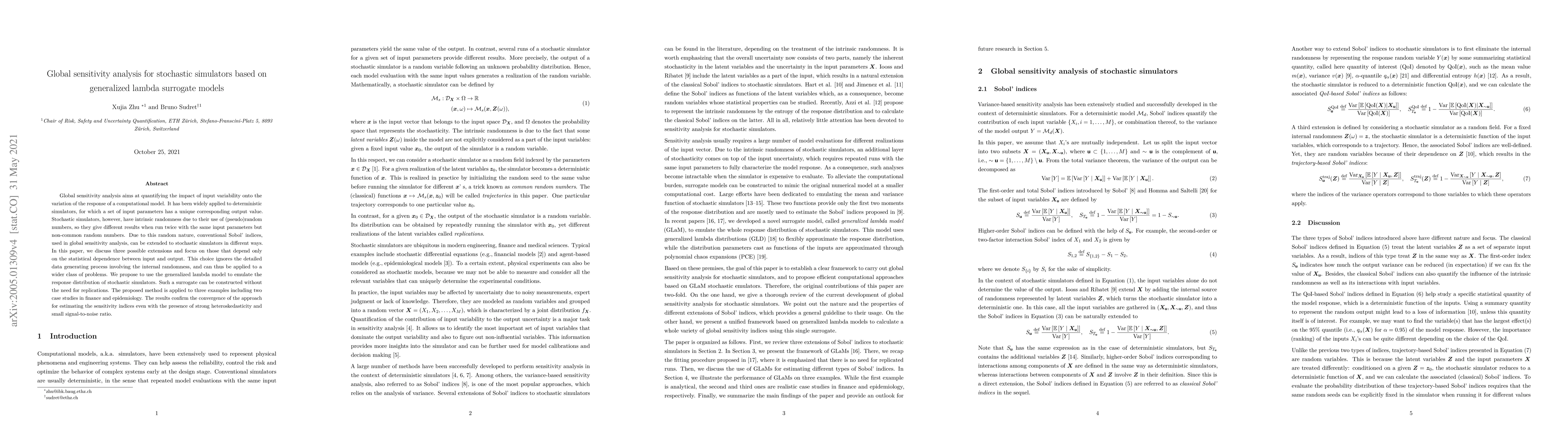 This paper explores global sensitivity analysis for stochastic simulators using generalized lambda surrogate models, proposing methods that focus on statistical dependence without requiring replications. It demonstrates the effectiveness of the approach through examples in finance and epidemiology, showing convergence even with heteroskedasticity and low signal-to-noise ratios.