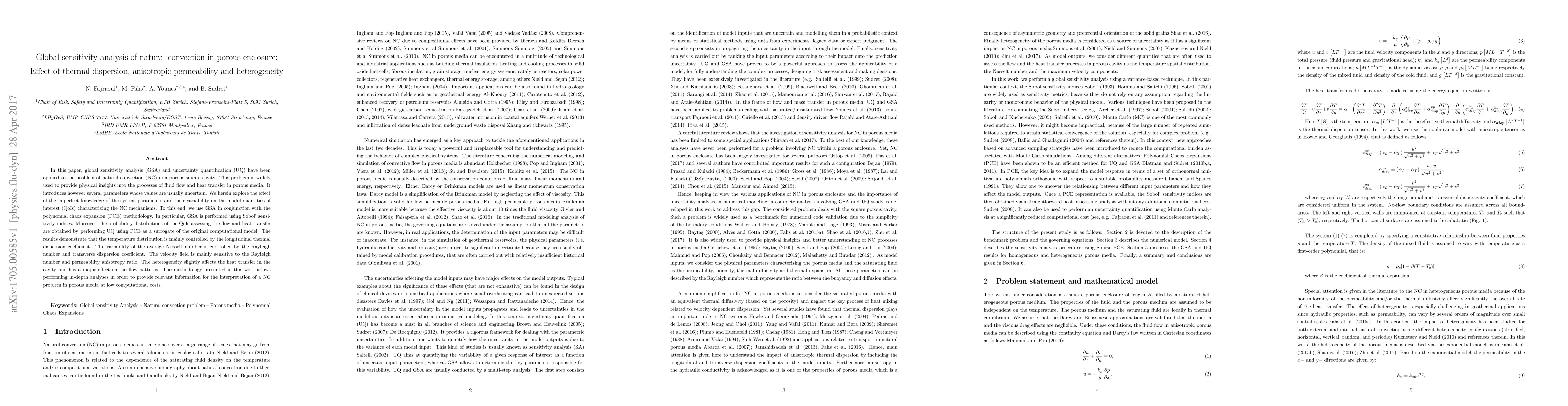 This paper conducts global sensitivity analysis and uncertainty quantification on natural convection in a porous square cavity, focusing on thermal dispersion, anisotropic permeability, and heterogeneity. The study reveals that temperature distribution is mainly influenced by the longitudinal thermal dispersion coefficient, while the average Nusselt number's variability is affected by the Rayleigh number and transverse dispersion coefficient.