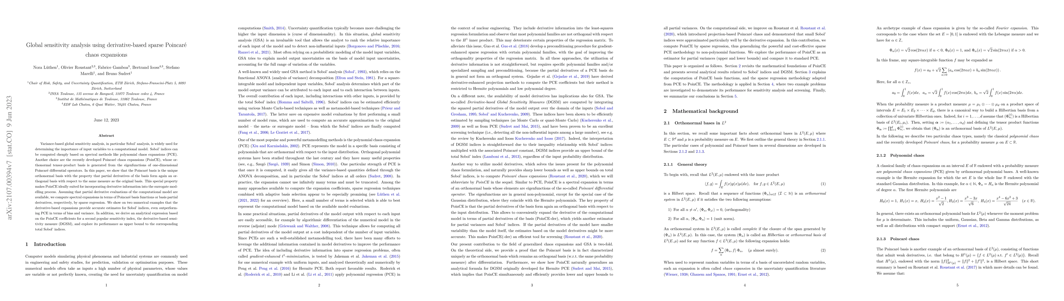 This paper introduces a novel global sensitivity analysis method using derivative-based sparse Poincaré chaos expansions, demonstrating that Poincaré basis functions maintain orthogonality under partial derivatives. The method shows improved accuracy and efficiency over polynomial chaos expansions in estimating Sobol' indices and other sensitivity measures.