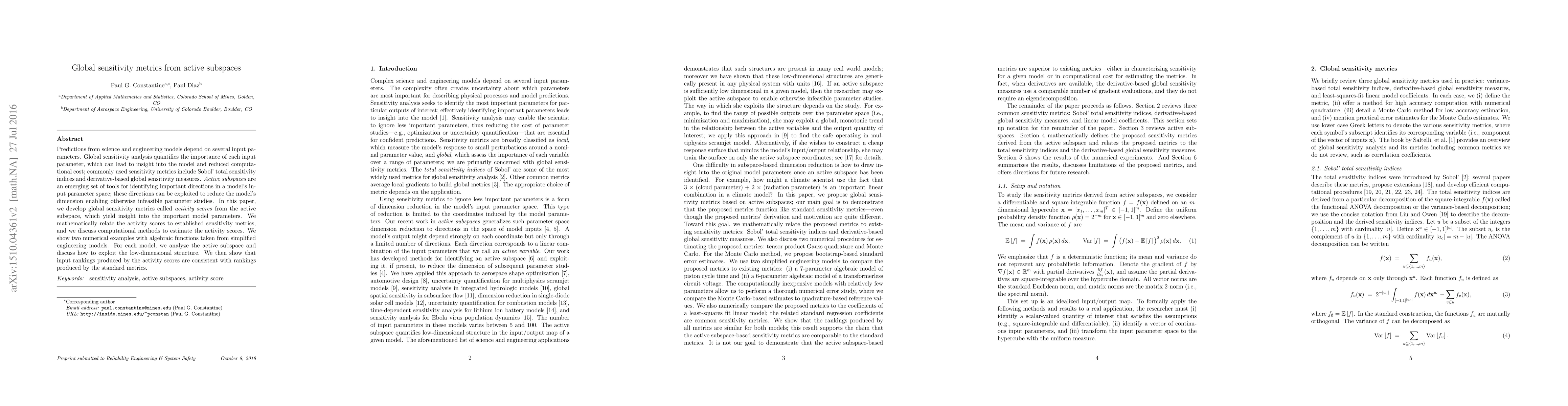 The research develops global sensitivity metrics called activity scores from active subspaces, relating them to established sensitivity metrics like Sobol' total sensitivity indices and derivative-based global sensitivity measures. It discusses computational methods to estimate the activity scores and demonstrates their application through two numerical examples from simplified engineering models.