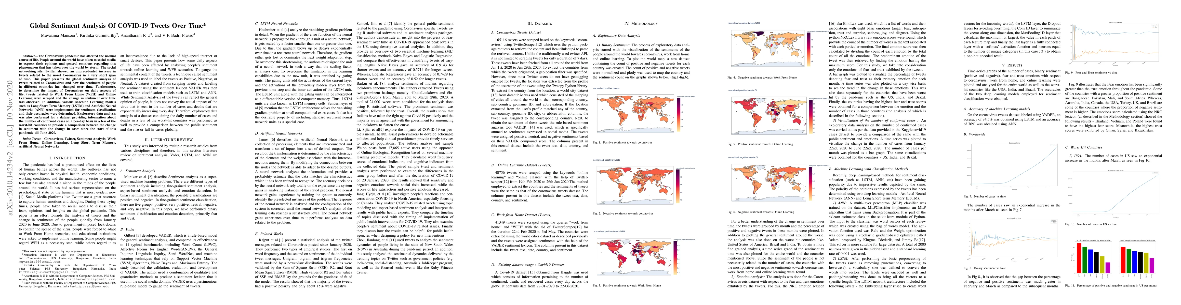 This paper conducts a global sentiment analysis of COVID-19 related tweets over time, employing machine learning models like LSTM and ANN to classify sentiment. It also examines the sentiment changes regarding Work From Home and Online Learning, comparing sentiment shifts with the progression of COVID-19 cases in several severely affected countries up to June 2020.