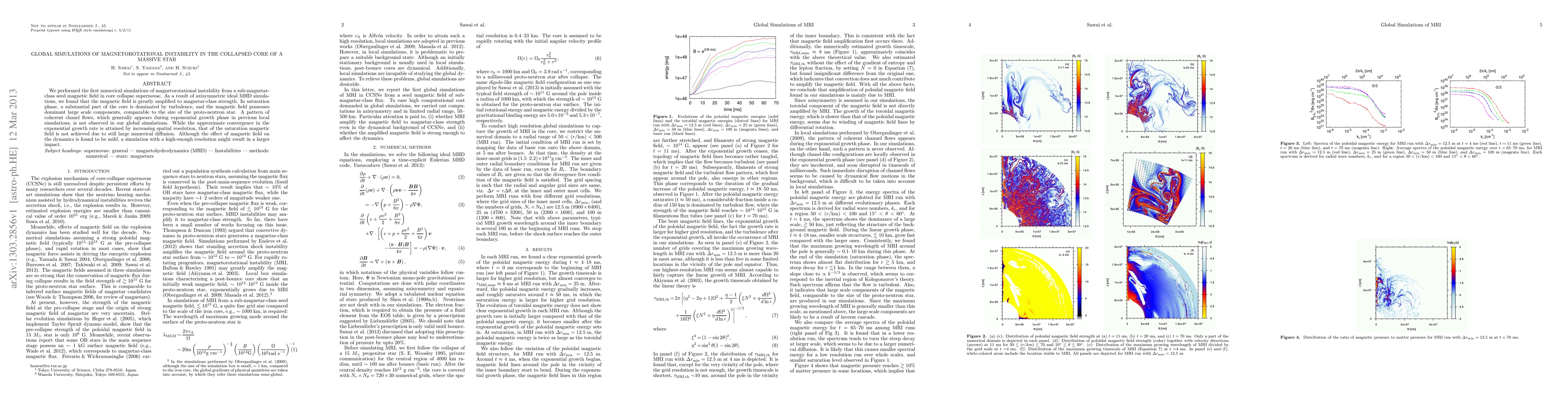 We performed the first numerical simulations of magnetorotational instability from a sub-magnetar-class seed magnetic field in core collapse supernovae. As a result of axisymmetric ideal MHD simulations, we found that the magnetic field is greatly amplified to magnetar-class strength. In saturation phase, a substantial part of the core is dominated by turbulence, and the magnetic field possesses dominant large scale components, comparable to the size of the proto-neutron star. A pattern of coherent chanel flows, which generally appears during exponential growth phase in previous local simulations, is not observed in our global simulations. While the approximate convergence in the exponential growth rate is attained by increasing spatial resolution, that of the saturation magnetic field is not achieved due to still large numerical diffusion. Although the effect of magnetic field on the dynamics is found to be mild, a simulation with a high-enough resolution might result in a larger impact.