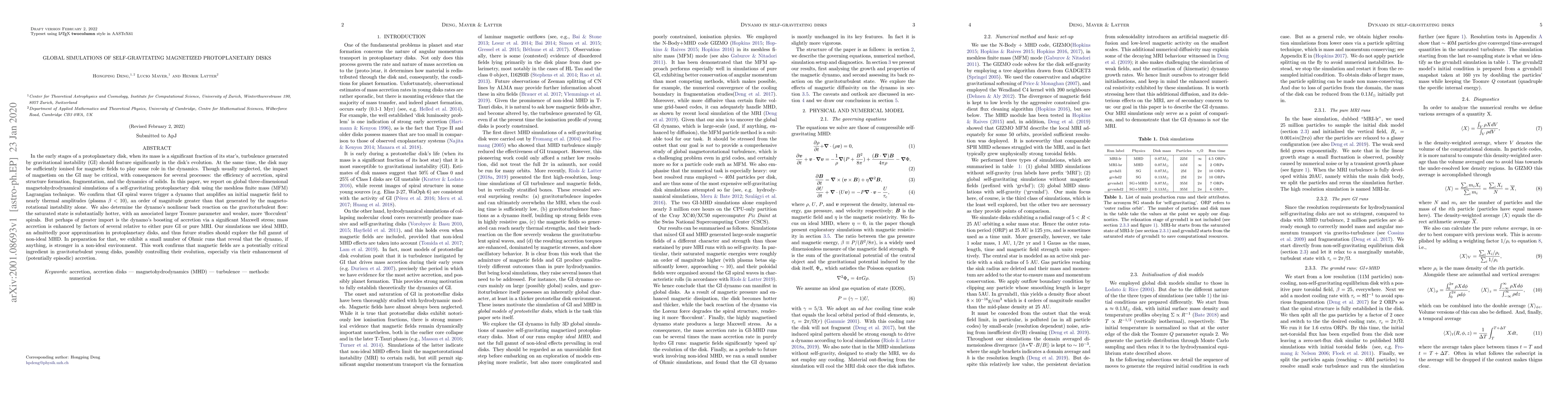 In the early stages of a protoplanetary disk, when its mass is a significant fraction of its star's, turbulence generated by gravitational instability (GI) should feature significantly in the disk's evolution. At the same time, the disk may be sufficiently ionised for magnetic fields to play some role in the dynamics. Though usually neglected, the impact of magnetism on the GI may be critical, with consequences for several processes: the efficiency of accretion, spiral structure formation, fragmentation, and the dynamics of solids. In this paper, we report on global three-dimensional magnetohydrodynamical simulations of a self-gravitating protoplanetary disk using the meshless finite mass (MFM) Lagrangian technique. We confirm that GI spiral waves trigger a dynamo that amplifies an initial magnetic field to nearly thermal amplitudes (plasma beta < 10), an order of magnitude greater than that generated by the magneto-rotational instability alone. We also determine the dynamo's nonlinear back reaction on the gravitoturbulent flow: the saturated state is substantially hotter, with an associated larger Toomre parameter and weaker, more 'flocculent' spirals. But perhaps of greater import is the dynamo's boosting of accretion via a significant Maxwell stress; mass accretion is enhanced by factors of several relative to either pure GI or pure MRI. Our simulations use ideal MHD, an admittedly poor approximation in protoplanetary disks, and thus future studies should explore the full gamut of non-ideal MHD. In preparation for that, we exhibit a small number of Ohmic runs that reveal that the dynamo, if anything, is stronger in a non-ideal environment. This work confirms that magnetic fields are a potentially critical ingredient in gravitoturbulent young disks, possibly controlling their evolution, especially via their enhancement of (potentially episodic) accretion.