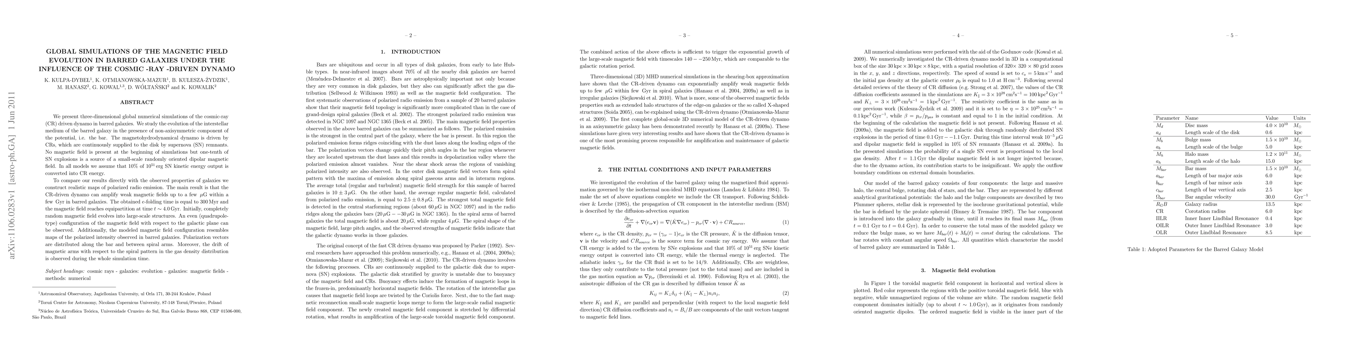 This paper presents global simulations of the magnetic field evolution in barred galaxies driven by cosmic rays from supernova remnants. The study finds that the cosmic-ray-driven dynamo can amplify weak magnetic fields up to a few microgauss within a few gigayears, reaching equipartition at around 4.0 Gyr, and forming large-scale magnetic field structures resembling observed polarized radio emissions in barred galaxies.