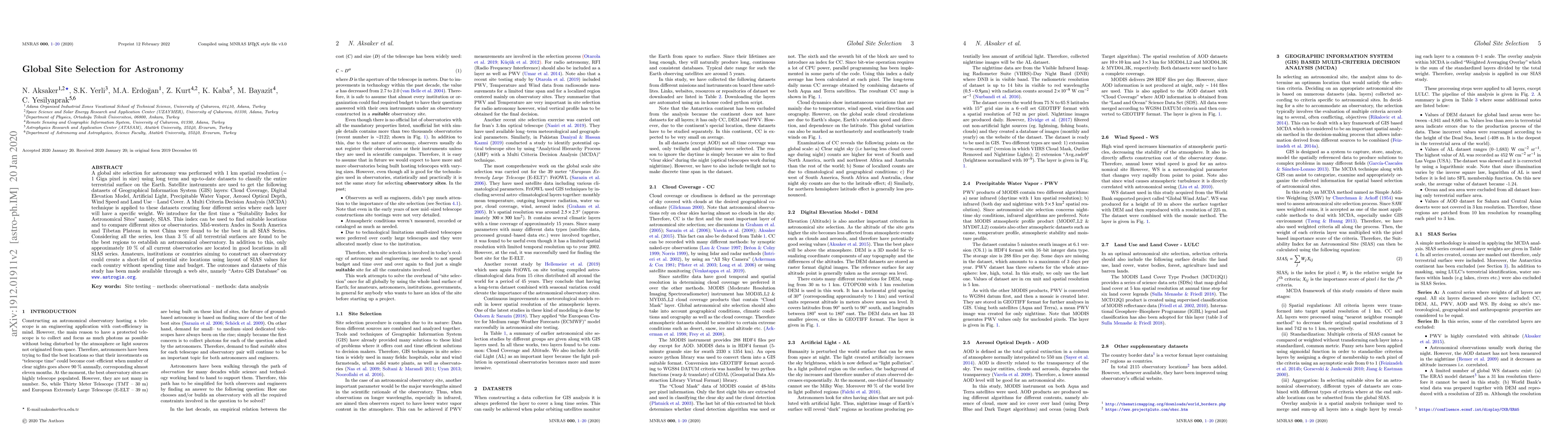 A global site selection for astronomy was performed with 1 km spatial resolution ($\sim$ 1 Giga pixel in size) using long term and up-to-date datasets to classify the entire terrestrial surface on the Earth. Satellite instruments are used to get the following datasets of Geographical Information System (GIS) layers: Cloud Coverage, Digital Elevation Model, Artificial Light, Precipitable Water Vapor, Aerosol Optical Depth, Wind Speed and Land Use -- Land Cover. A Multi Criteria Decision Analysis (MCDA) technique is applied to these datasets creating four different series where each layer will have a specific weight. We introduce for the first time a ``Suitability Index for Astronomical Sites'' namely, SIAS. This index can be used to find suitable locations and to compare different sites or observatories. Mid-western Andes in South America and Tibetan Plateau in west China were found to be the best in all SIAS Series. Considering all the series, less than 3 \% of all terrestrial surfaces are found to be the best regions to establish an astronomical observatory. In addition to this, only approximately 10 \% of all current observatories are located in good locations in all SIAS series. Amateurs, institutions or countries aiming to construct an observatory could create a short-list of potential site locations using layout of SIAS values for each country without spending time and budget.The outcomes and datasets of this study has been made available through a web site, namely ``Astro GIS Database'' on \texttt{\url{www.astrogis.org}}.