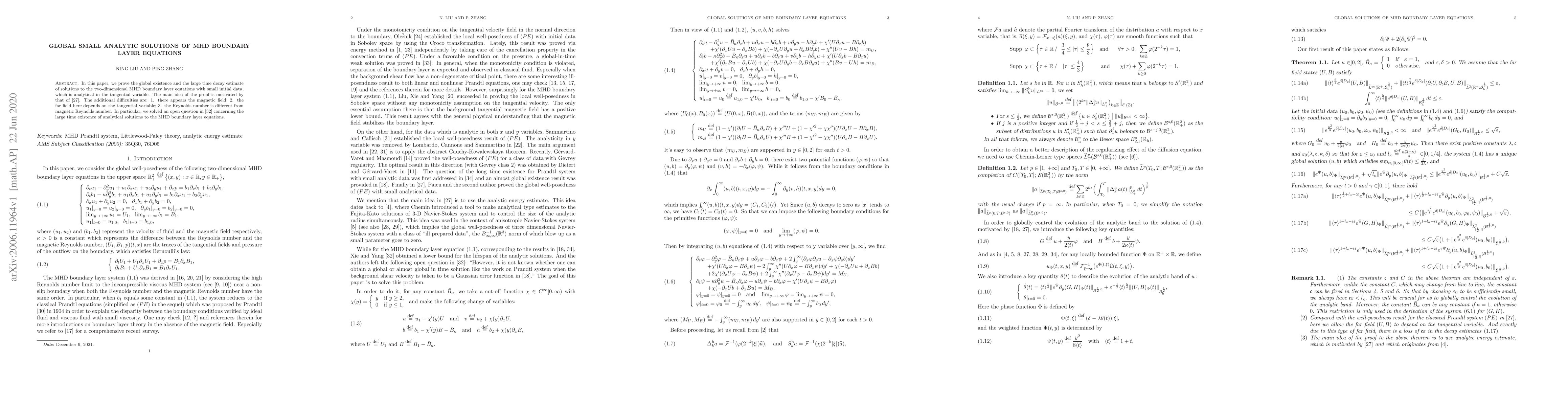 This paper proves the global existence and large time decay of small, analytically tangential initial data solutions to two-dimensional MHD boundary layer equations, addressing unique challenges such as the magnetic field and differing Reynolds numbers. The proof builds on techniques from \cite{PZ5} and resolves an open question from \cite{XY19}.