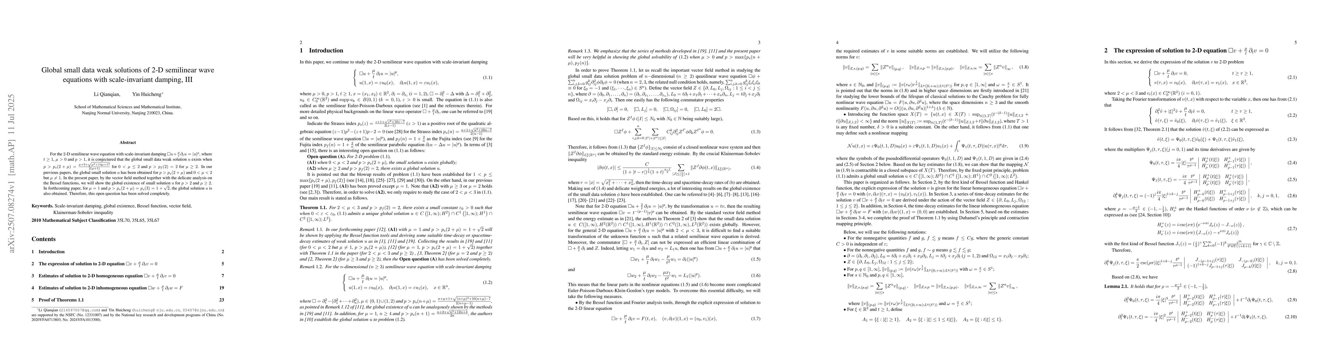For the $2$-D semilinear wave equation with scale-invariant damping $\square u+\frac{\mu}{t}\partial_tu=|u|^p$, where $t\geq 1$, $\mu>0$ and $p>1$, it is conjectured that the global small data weak solution $u$ exists when $p>p_{s}(2+\mu) =\frac{\mu+3+\sqrt{\mu^2+14\mu+17}}{2(\mu+1)}$ for $0<\mu\leq 2$ and $p>p_f(2)=2$ for $\mu\geq 2$. In our previous papers, the global small solution $u$ has been obtained for $p>p_{s}(2+\mu)$ and $0<\mu<2$ but $\mu\not=1$. In the present paper, by the vector field method together with the delicate analysis on the Bessel functions, we will show the global existence of small solution $u$ for $p>2$ and $\mu>2$. In forthcoming paper, for $\mu=1$ and $p>p_{s}(2+\mu)=p_{s}(3)=1+\sqrt 2$, the global solution $u$ is also obtained. Therefore, collecting our series of conclusions together with partial results from others, this open question has been solved completely.