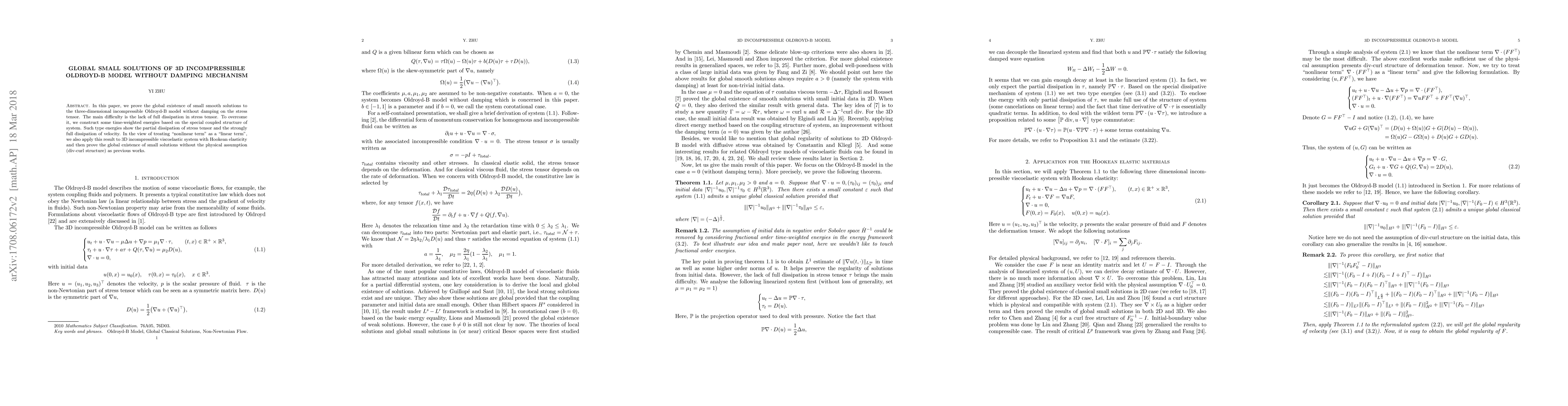This paper proves the global existence of small smooth solutions for the 3D incompressible Oldroyd-B model without damping, addressing the lack of full dissipation in the stress tensor through time-weighted energies. This approach also extends to 3D incompressible viscoelastic systems with Hookean elasticity, proving global existence without relying on previous assumptions.