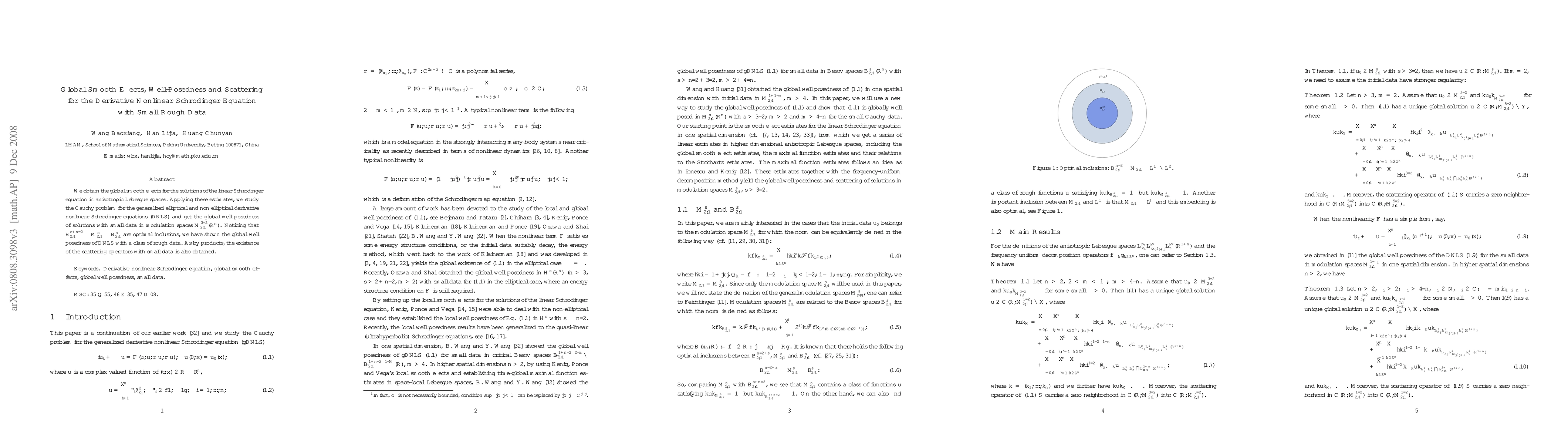 \rm We obtain the global smooth effects for the solutions of the linear Schr\"odinger equation in anisotropic Lebesgue spaces. Applying these estimates, we study the Cauchy problem for the generalized elliptical and non-elliptical derivative nonlinear Schr\"odinger equations (DNLS) and get the global well posedness of solutions with small data in modulation spaces $M^{3/2}_{2,1}(\mathbb{R}^n)$. Noticing that $H^{\tilde{s}} \subset M^s_{2,1}$ $(\tilde{s}-s>n/2)$ is an optimal inclusion, we have shown the global well posedness of DNLS with a class of very rough data.