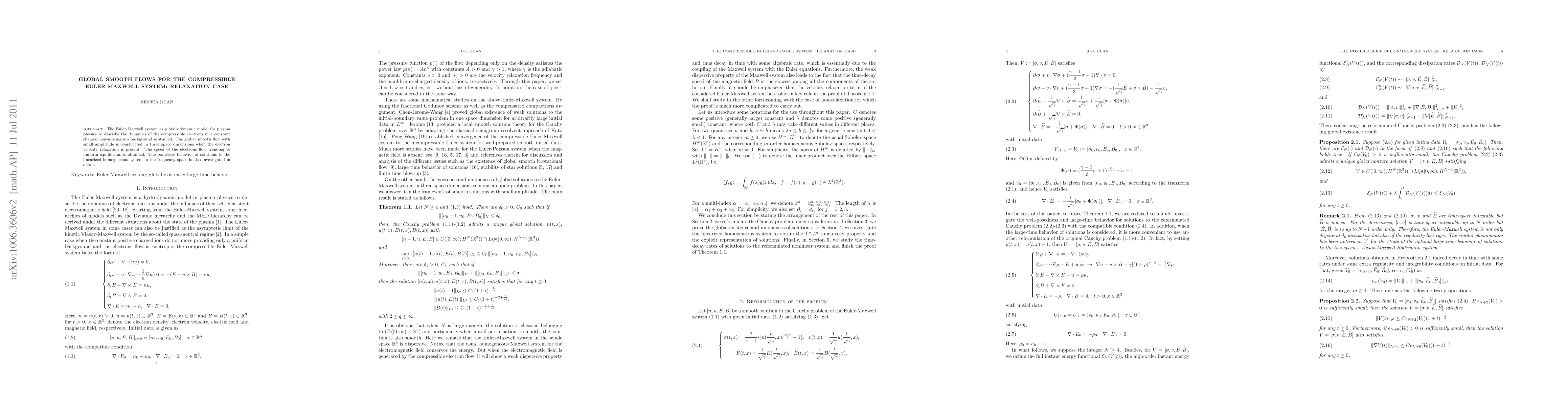 The Euler-Maxwell system as a hydrodynamic model for plasma physics to describe the dynamics of the compressible electrons in a constant charged non-moving ion background is studied. The global smooth flow with small amplitude is constructed in three space dimensions when the electron velocity relaxation is present. The speed of the electrons flow trending to uniform equilibrium is obtained. The pointwise behavior of solutions to the linearized homogeneous system in the frequency space is also investigated in detail.