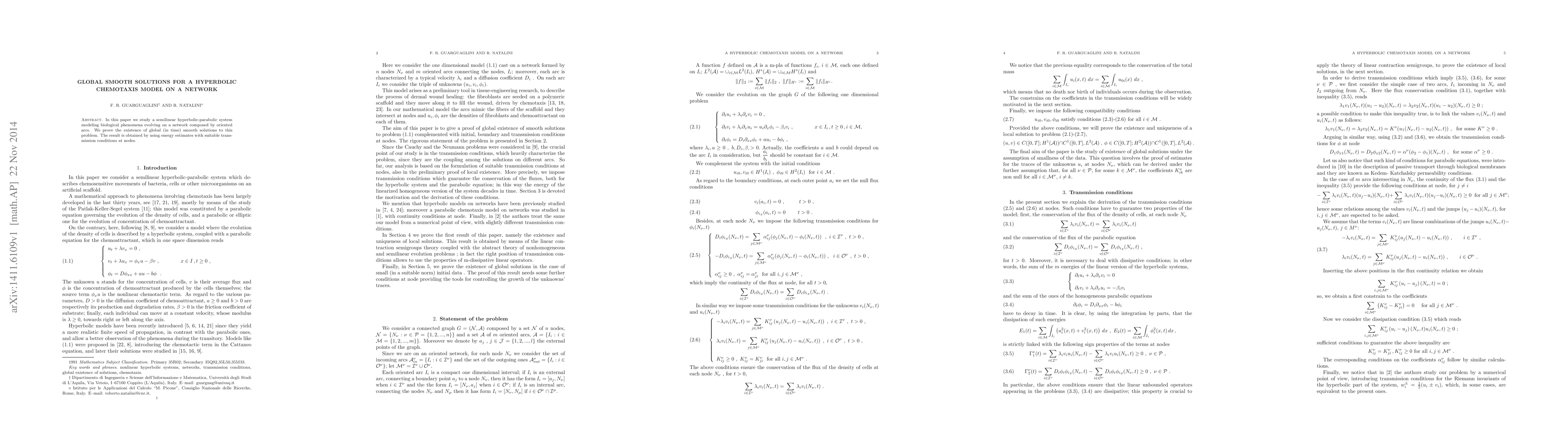 Researchers prove the existence of global smooth solutions to a hyperbolic chemotaxis model on a network, using energy estimates with transmission conditions at nodes.