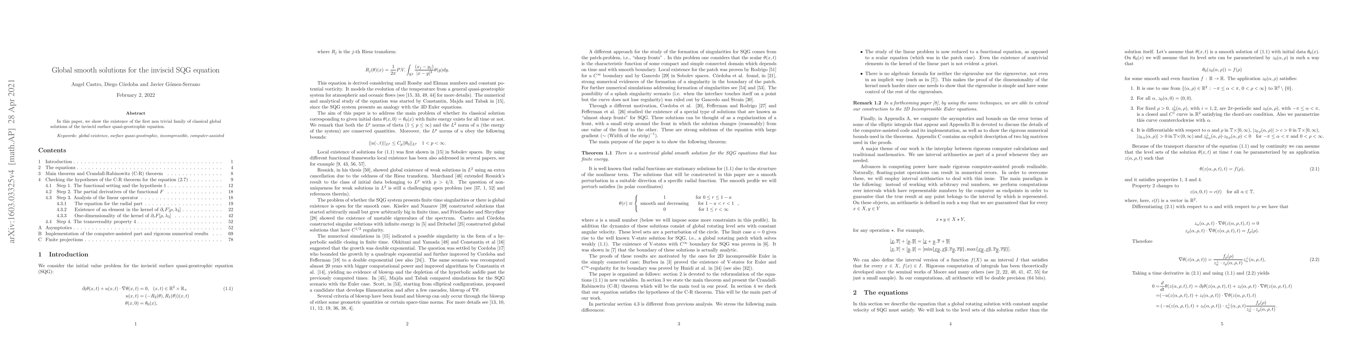 Summary: This paper establishes the existence of the first non-trivial family of classical global solutions for the inviscid surface quasi-geostrophic equation, advancing understanding of its dynamics.
