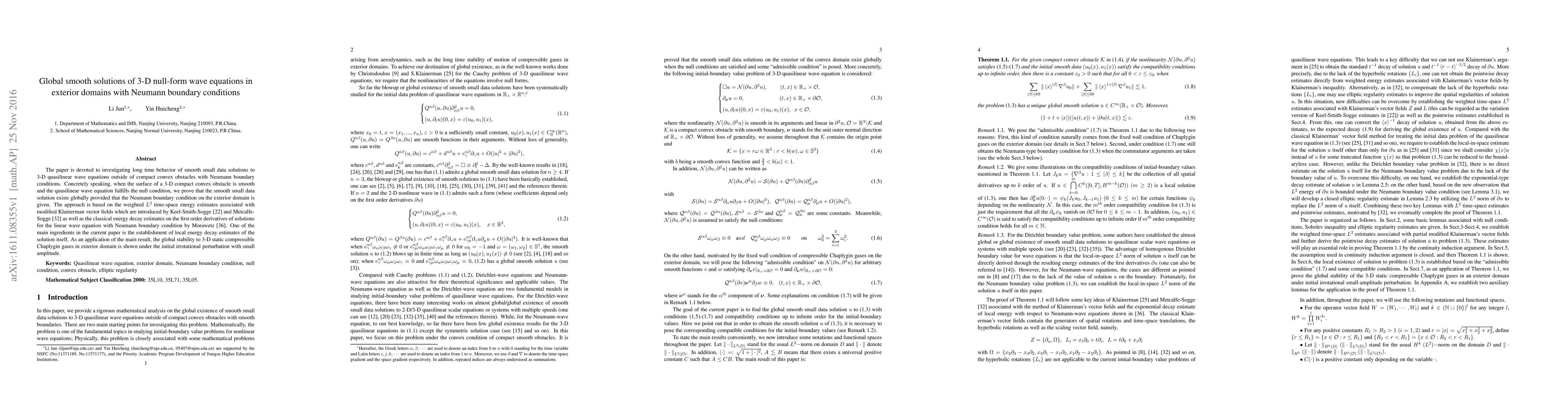 Summary: This paper studies the long-term behavior of smooth, small data solutions to 3-D quasilinear wave equations in exterior domains, focusing on the null-form wave equations with Neumann boundary conditions. It establishes global existence and smoothness of these solutions.